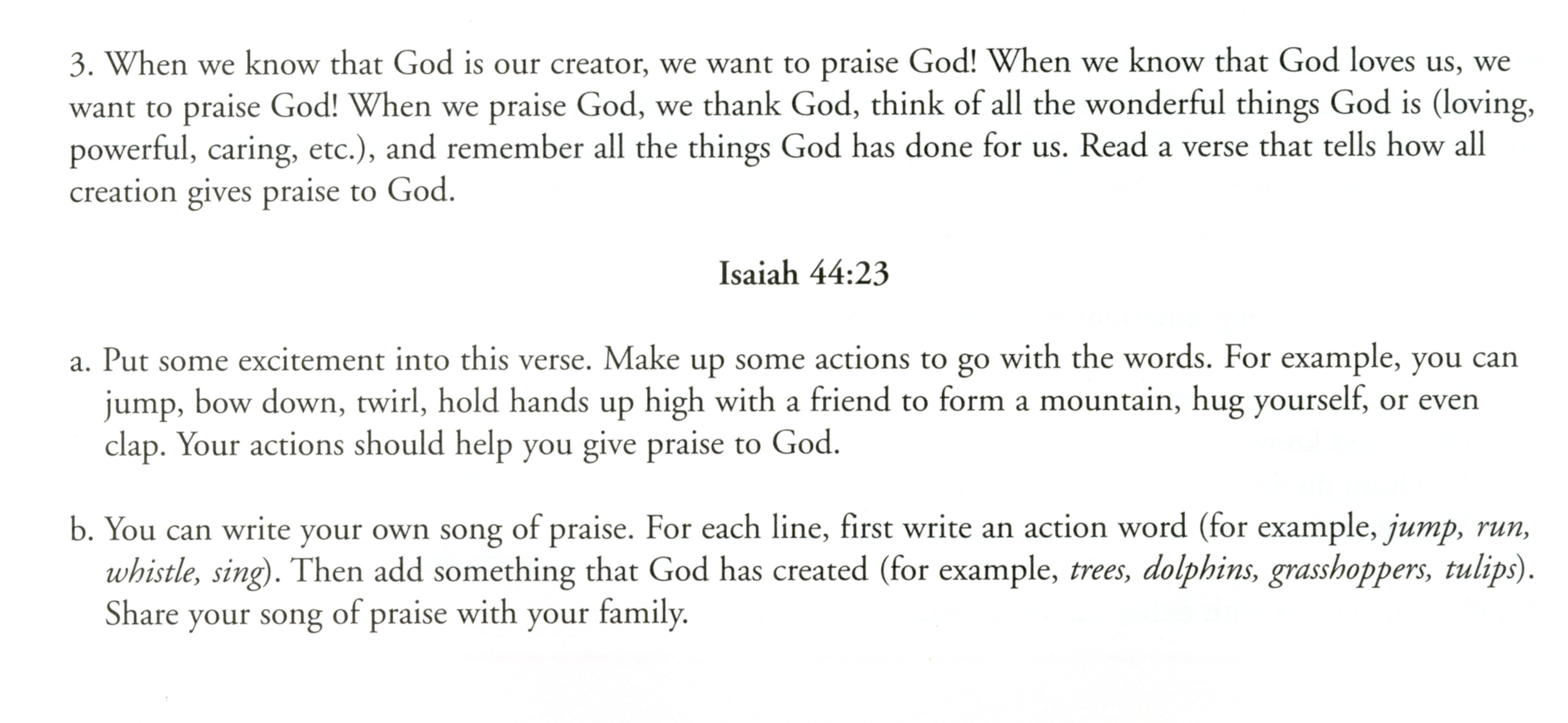 Give the students each a Bible. Talk about what it is. Explain how it works and how it is laid out. (See CCC 120-141.) Ask if they have a favorite Bible story. Read Genesis Chapter 1 through 2:3, the story of Creation. Talk about what you read. (See CCC 279-327, especially 289-292 and 295-301.)