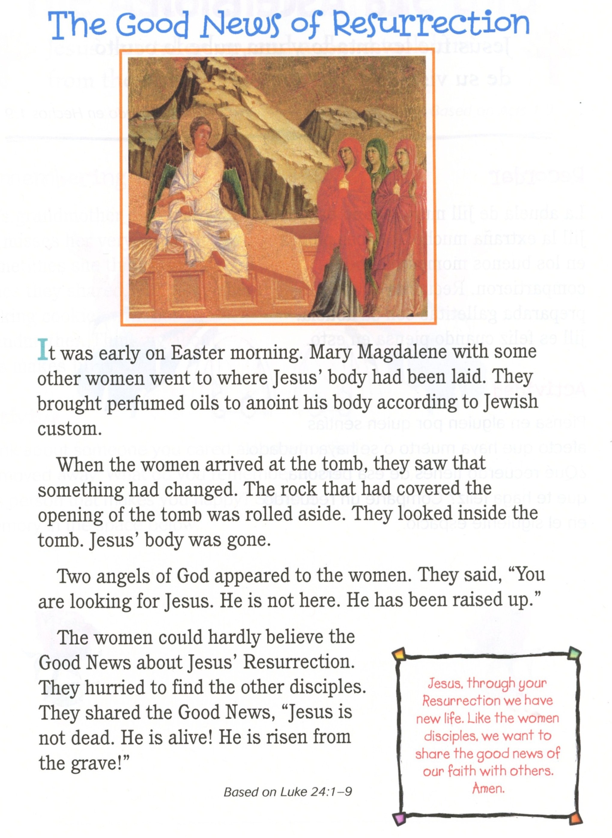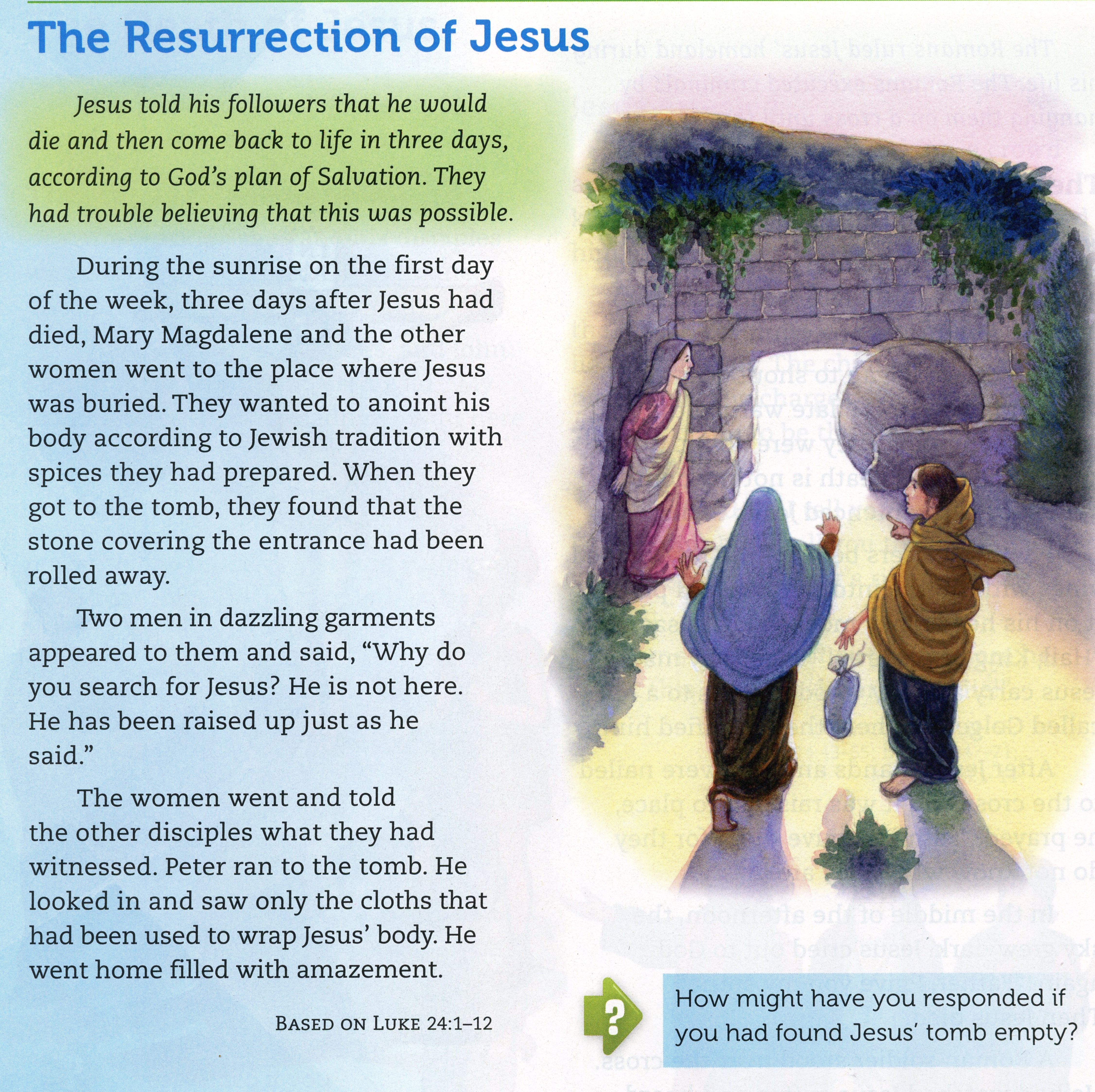 resurrection. It can also be found in Matthew 28:1-15, Mark 16:1-11, Luke 24:1-12
