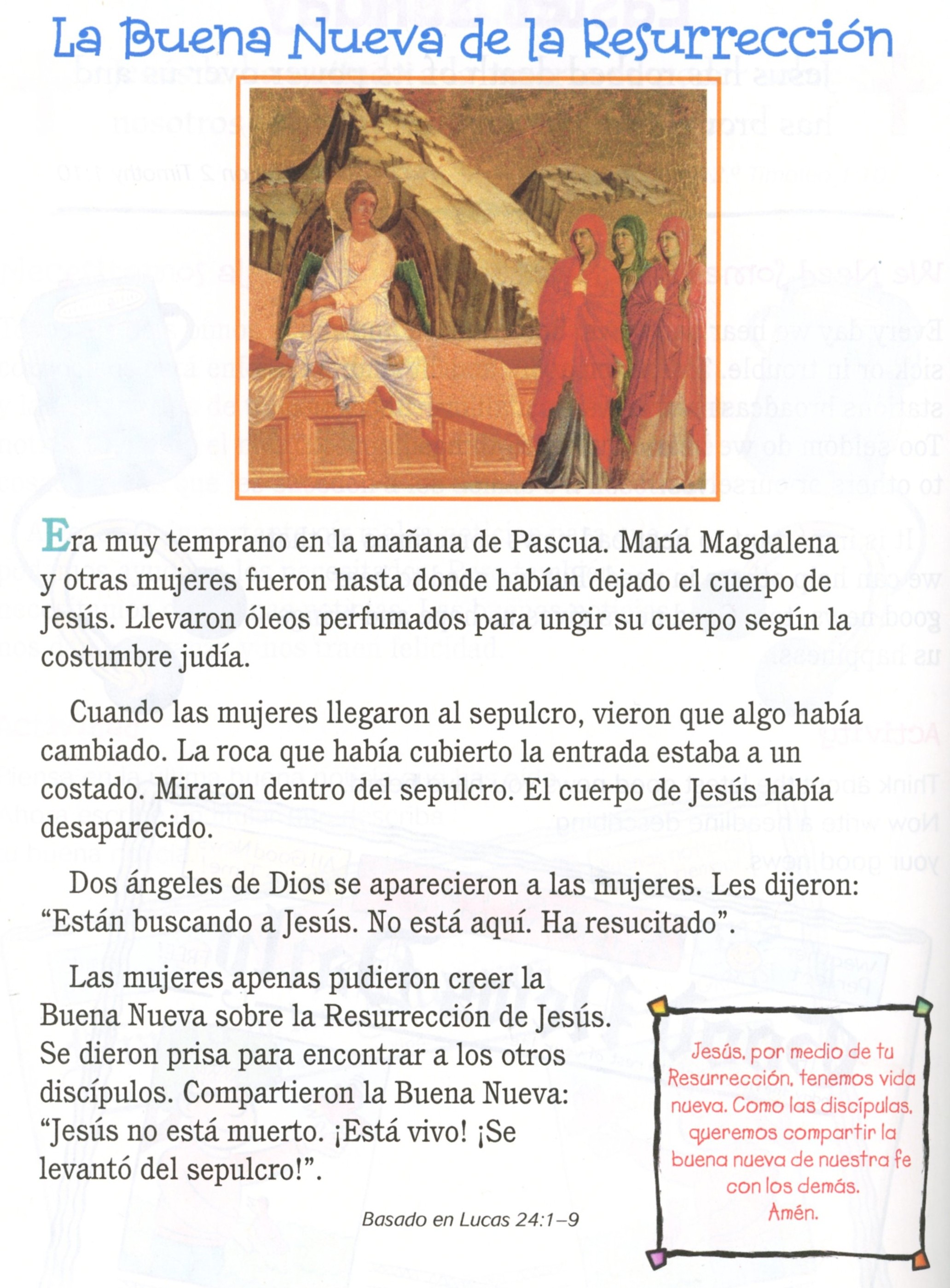 La lectura bíblica de hoy es Juan 20:1-18. También se puede encontrar en Mateo 28:1-15, Marcos 16:1-11 y Lucas 24:1-12. Las apariciones de Jesús posteriores se encuentran en Mateo 28:16-20, Marcos 16:12-18, Lucas 24:13-49, Juan 20:19-31; 21:1-19 y Hechos 1:1-5. La Ascensión se halla en Marcos 16:19-20, Lucas 24:50-53 y Hechos 1:6-12. Pentecostés se encuentra en Hechos 2:1-41.