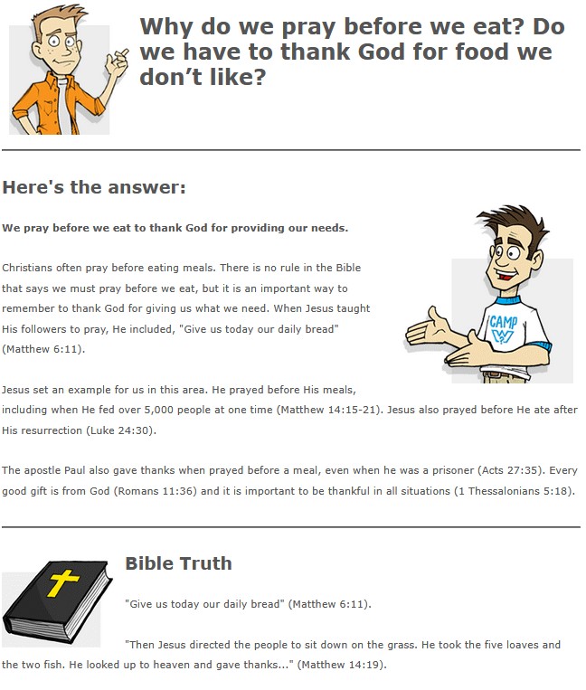Got Questions? Why do we pray before eating meals? - for kids Text only.