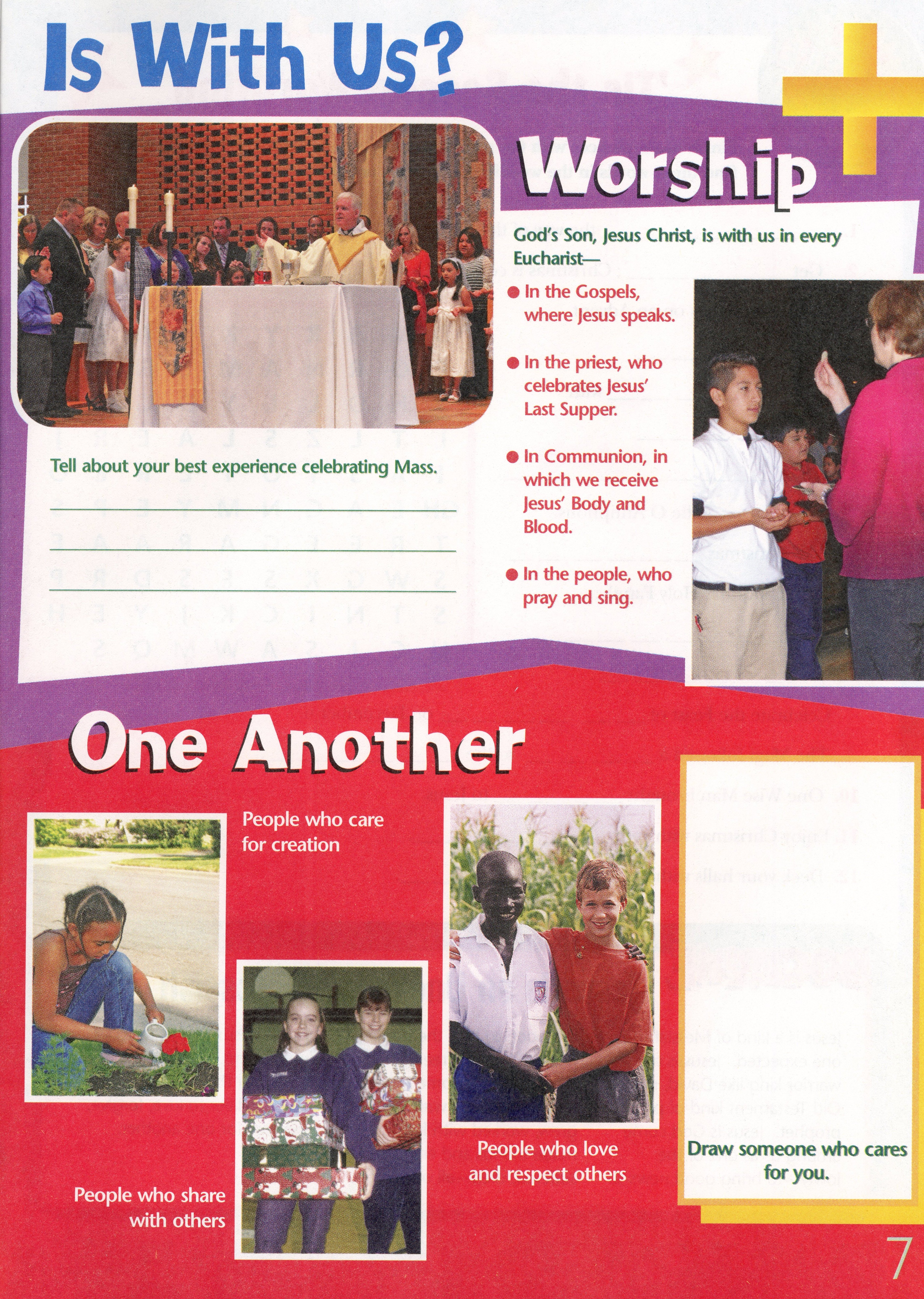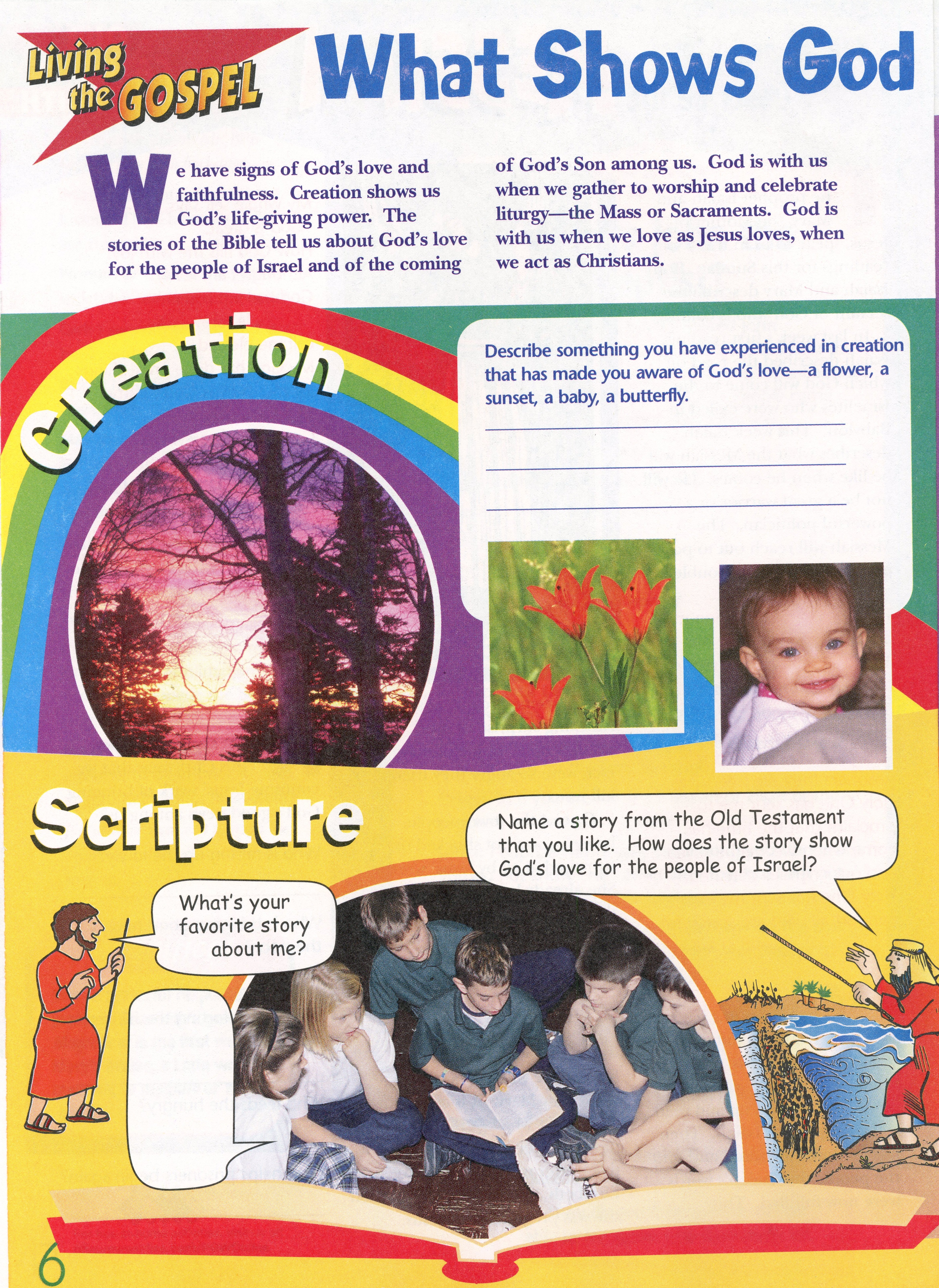 Give the students each a Bible. Talk about what it is. Explain how it works and how it is laid out. (See CCC 120-141.) Ask if they have a favorite Bible story. Read Genesis Chapter 1 through 2:3, the story of Creation. Talk about what you read. (See CCC 279-327, especially 289-292 and 295-301.)