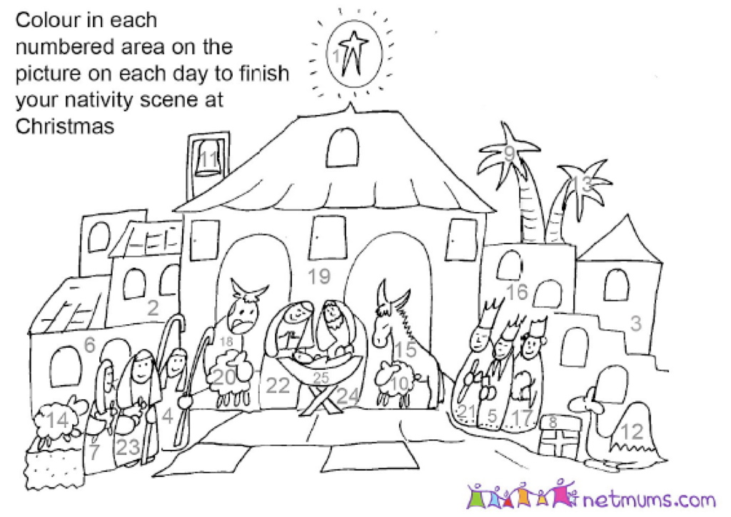 Activity: Advent Calendar: A Nativity scene to color one part each day during Advent).