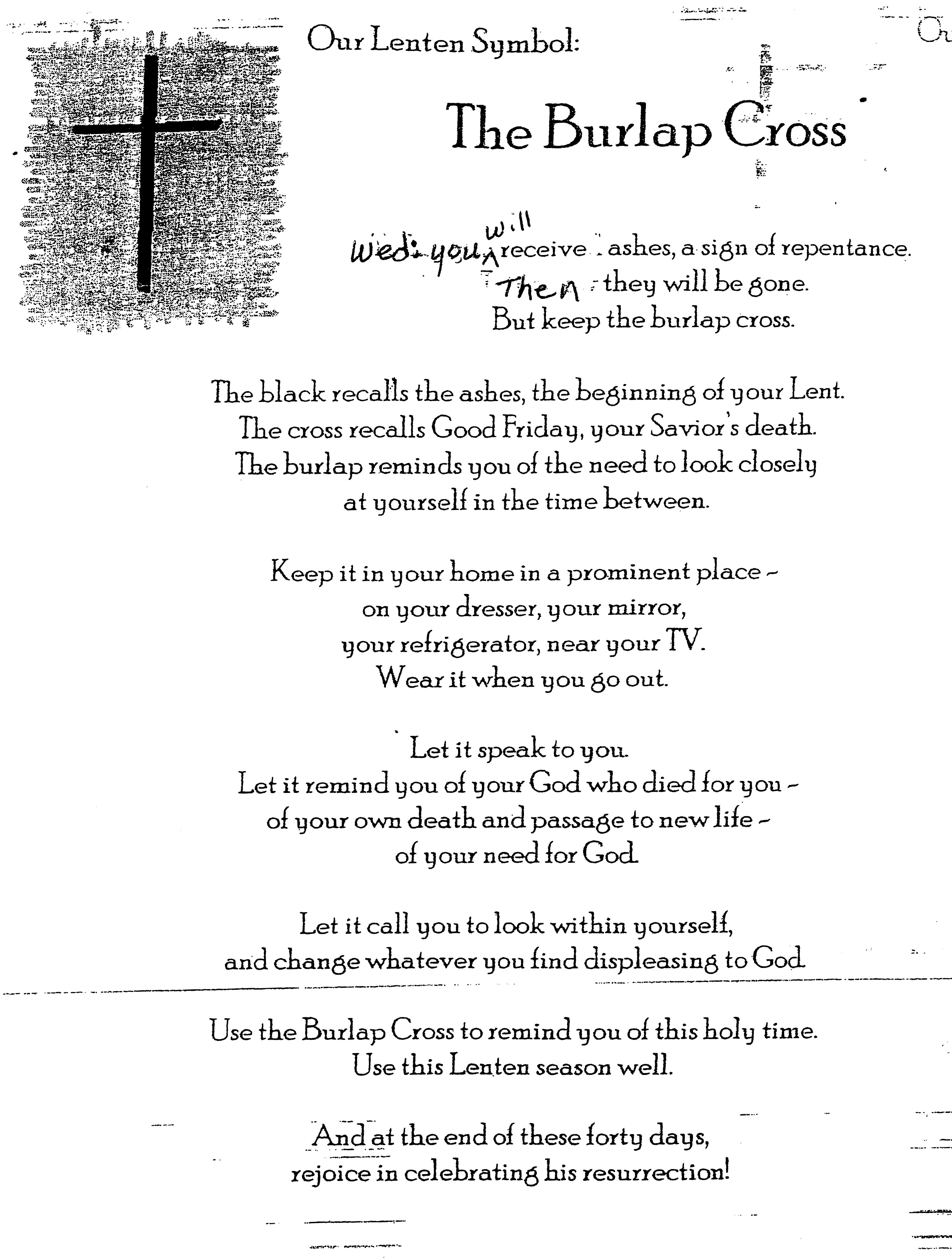 Ash Wednesday - Picture of the Burlap Cross