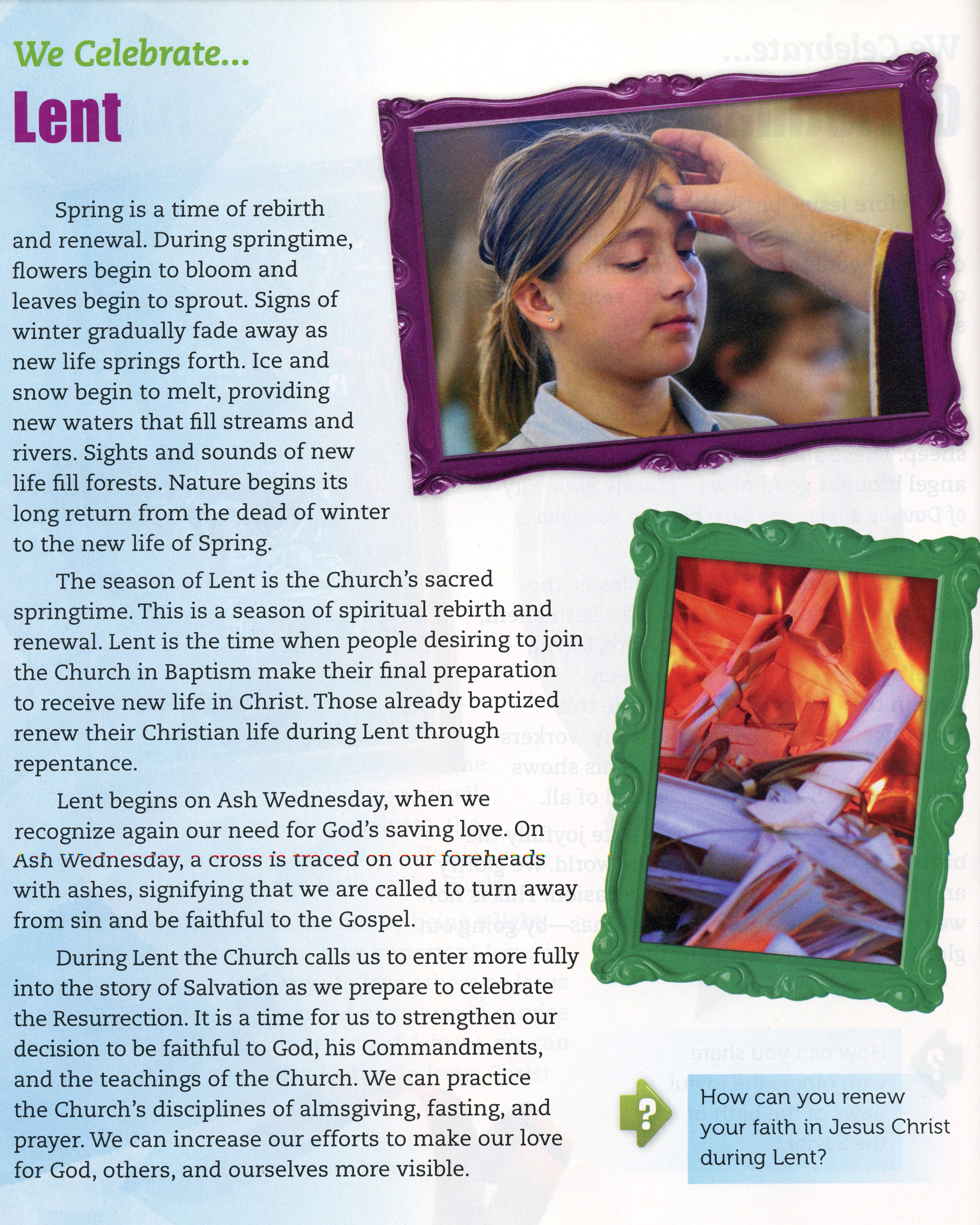 El objetivo de esta clase es explorar el significado del Miércoles de Ceniza y la Cuaresma. Esta lección debe incluir el significado del Miércoles de Ceniza como el inicio de un tiempo especial de oración y acción para dar más espacio a Jesús en nuestras vidas, haciendo hincapié en la oración, el ayuno y dar limosna al nivel que los niños puedan hacerlo.