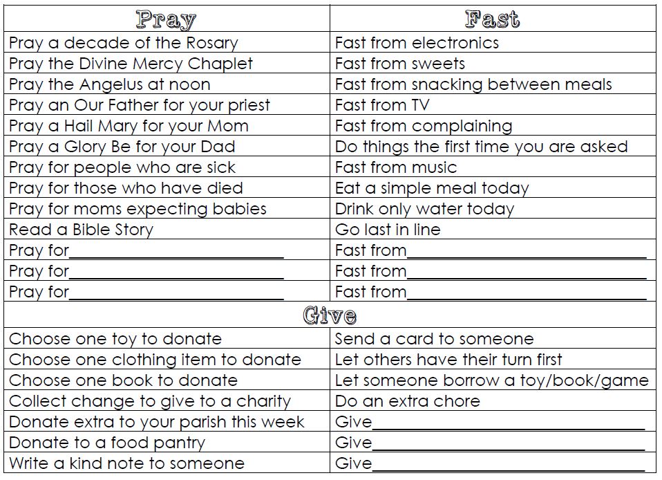 Prayer, Fast, Give ideas - lists several different activities to choose from for the children's special resolution depending on their age