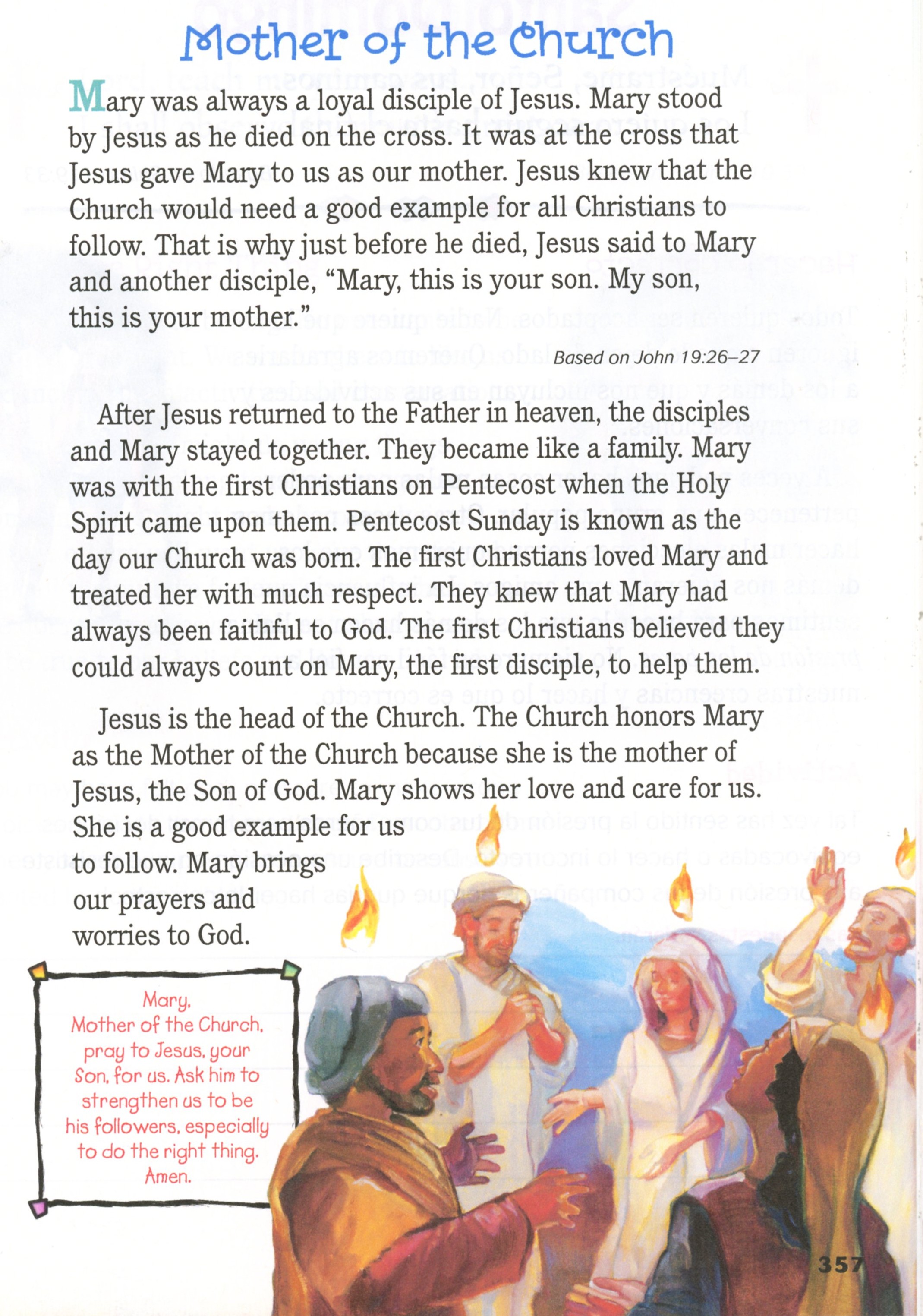 La lectura bíblica de hoy es Juan 20:1-18. También se puede encontrar en Mateo 28:1-15, Marcos 16:1-11 y Lucas 24:1-12. Las apariciones de Jesús posteriores se encuentran en Mateo 28:16-20, Marcos 16:12-18, Lucas 24:13-49, Juan 20:19-31; 21:1-19 y Hechos 1:1-5. La Ascensión se halla en Marcos 16:19-20, Lucas 24:50-53 y Hechos 1:6-12. Pentecostés se encuentra en Hechos 2:1-41.