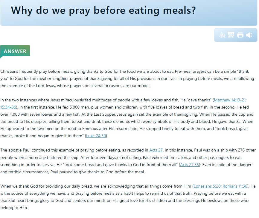 Got Questions? Why do we pray before eating meals? - for kids Text only.
