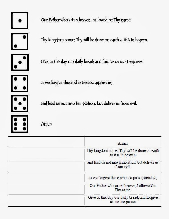 The Our Father - dice game, roll the dice and say the phrase and put in the right order at the bottom (solo en ingles)