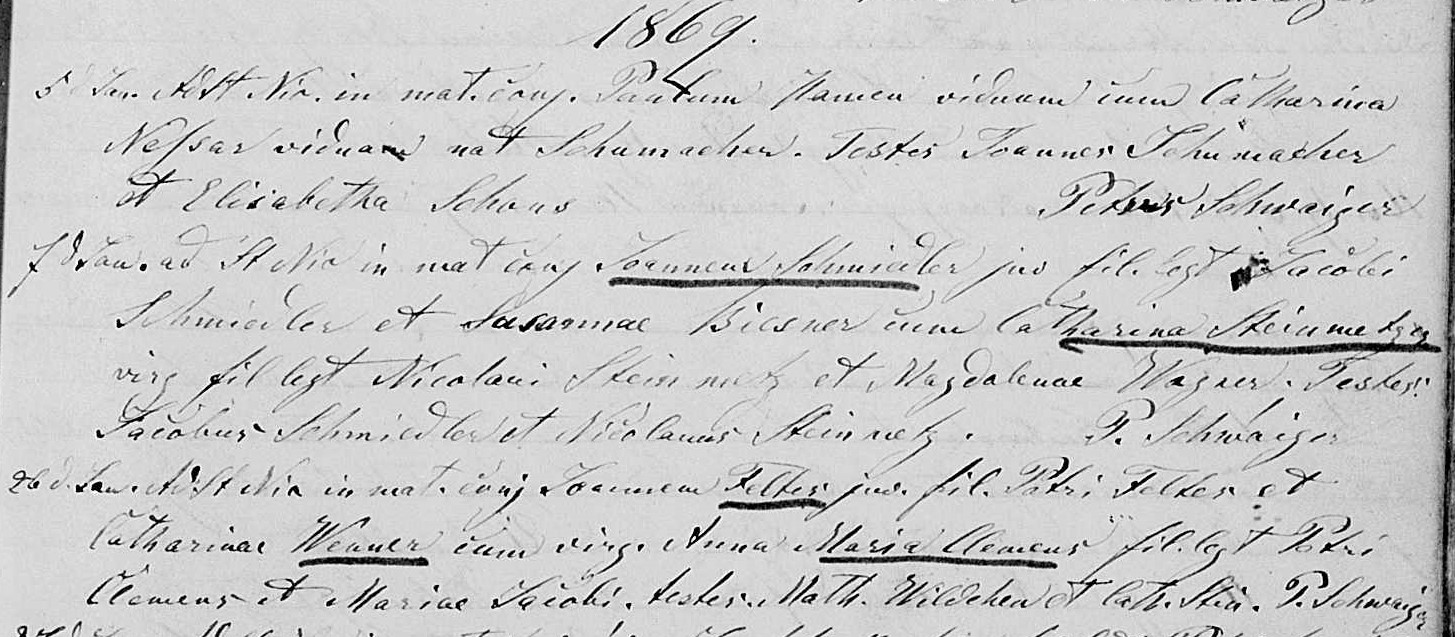 | 12 1869 Marriage record for John Feltes and Maria Clemens | |