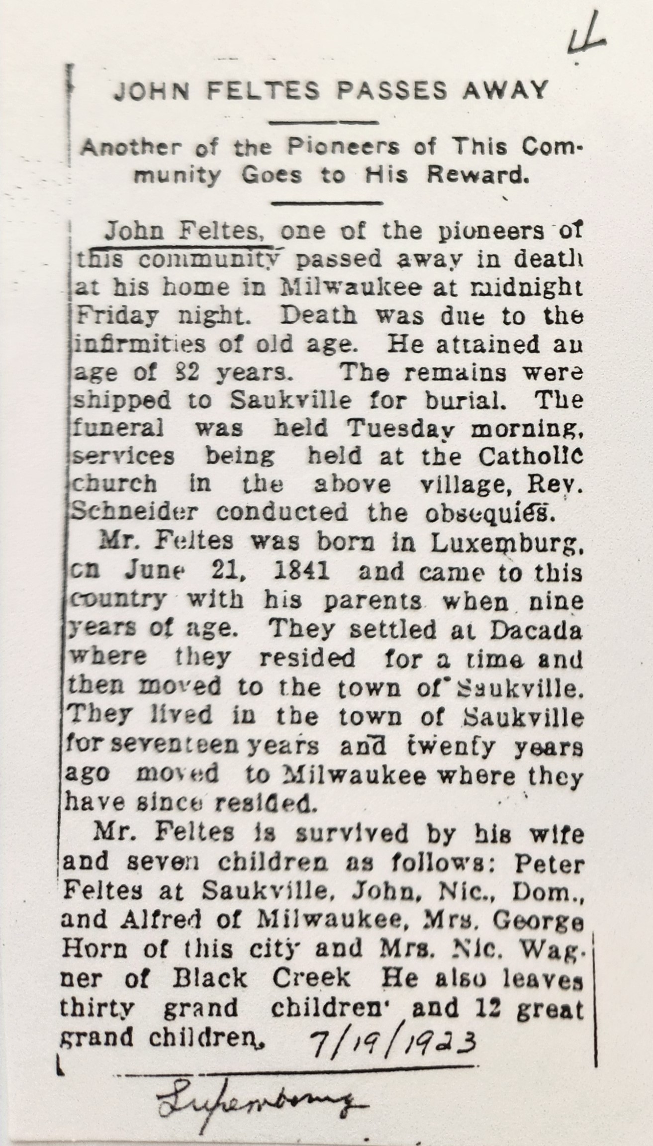 | Peter FELTES 30 22 23 | Nov. 3, 1869 Dacada, Sheboygan, WI. | Apr. 23, 1933 Saukville, Ozaukee, WI | Catherine Dries "Katie" (Sep 1869-1960) in 1896 | 2 | Buried: Saint Marys Cemetery, Saukville, Ozaukee County, Wisconsin, USA Find a Grave |