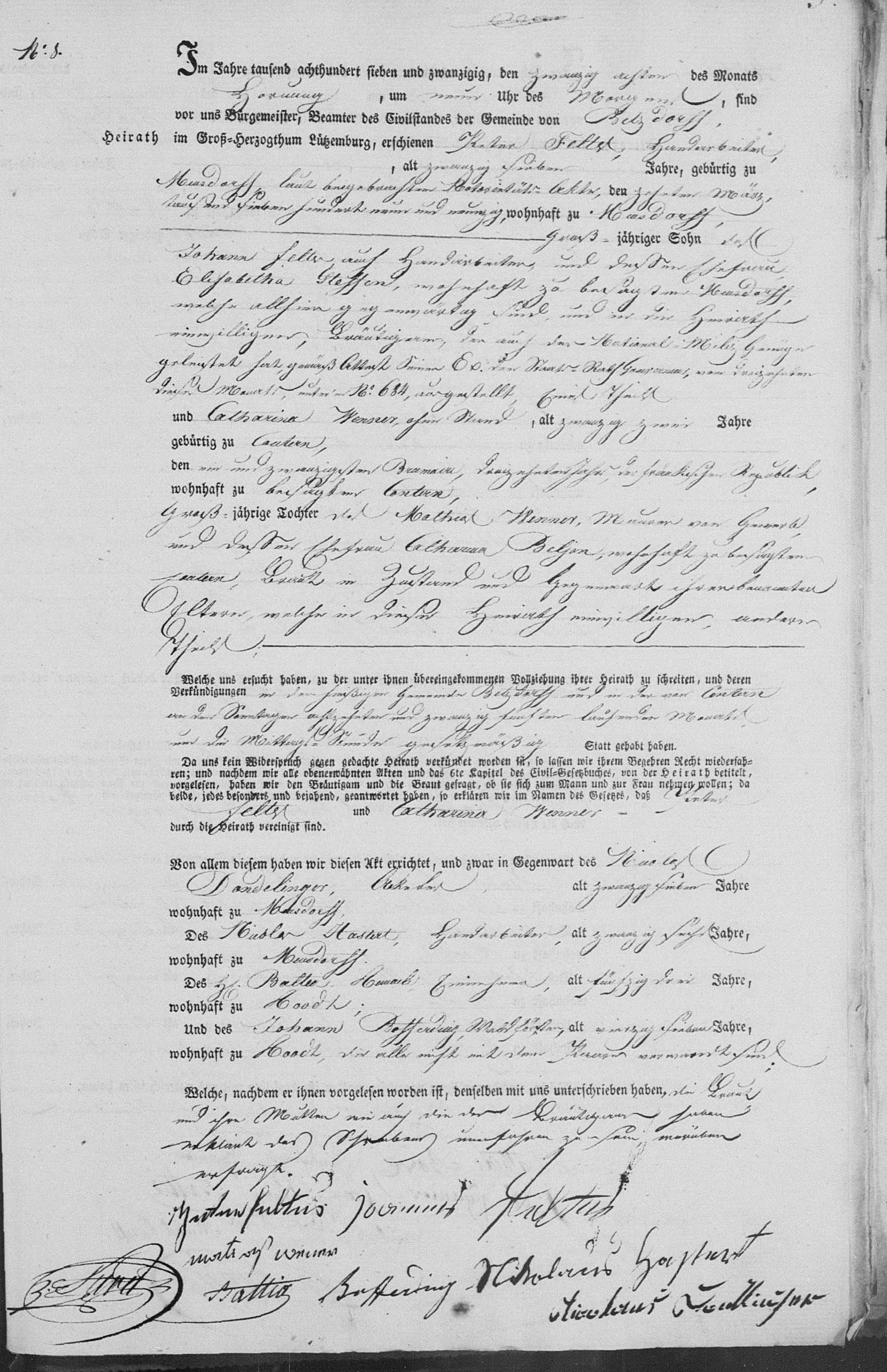 | 12 1827 Marriage Record of Johann Feltes and Catharina Wenner in the Luxembourg, Registres d'état civil de Betzdorf, Luxembourg, 1796-1941 from Family Search Microfilm #004378704, Image 446, Record #8 for the year 1827. | |