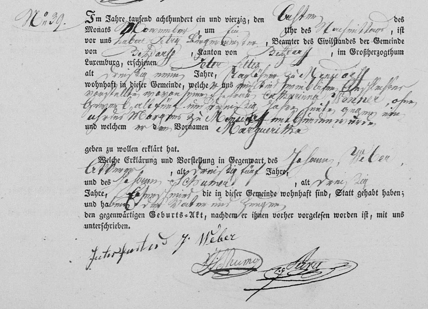 1841 Luxembourg birth record for Marguerithe Feltes (Susan)