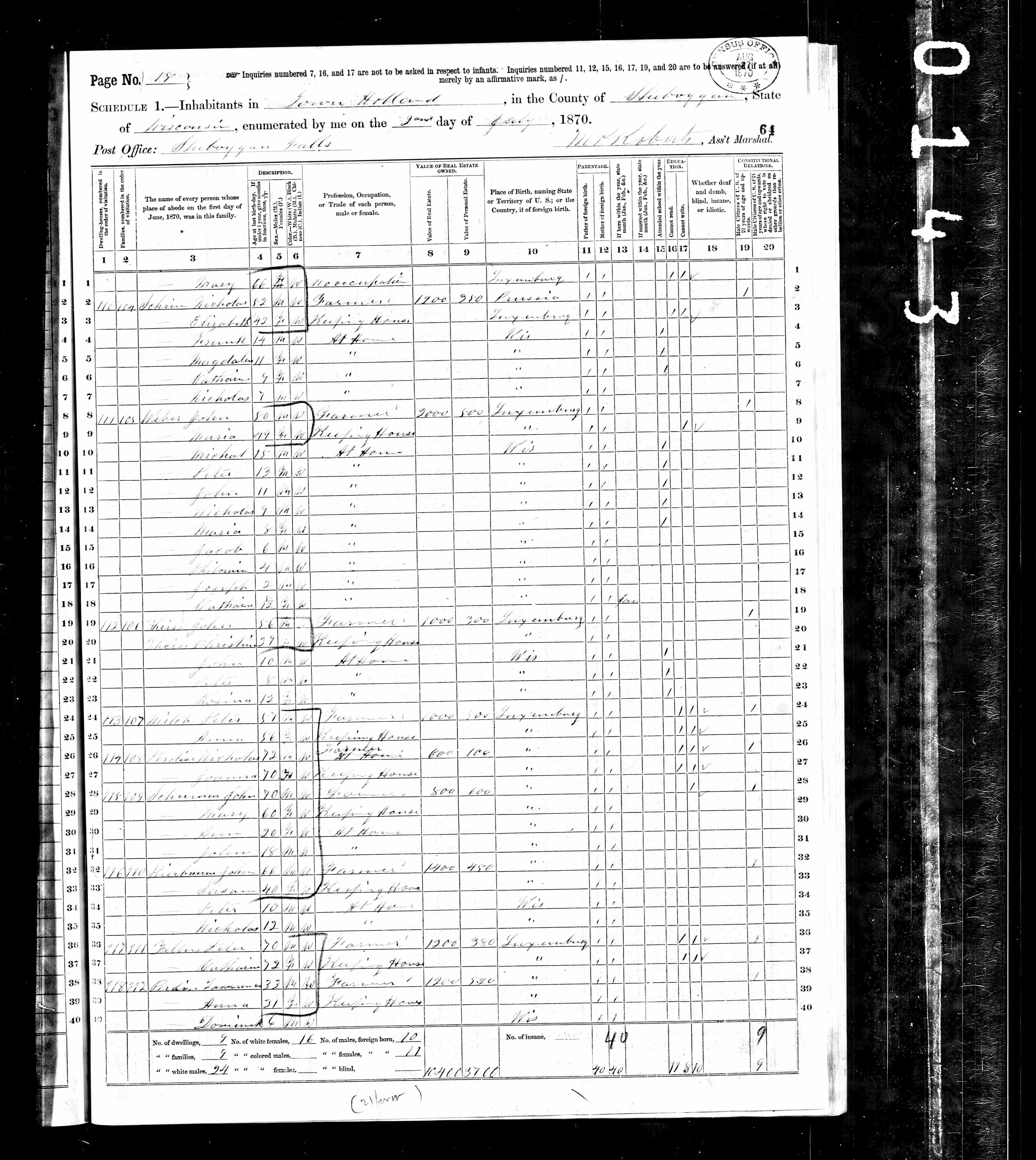 1870 Census Wisconsin, Sheboygan County, Holland Township