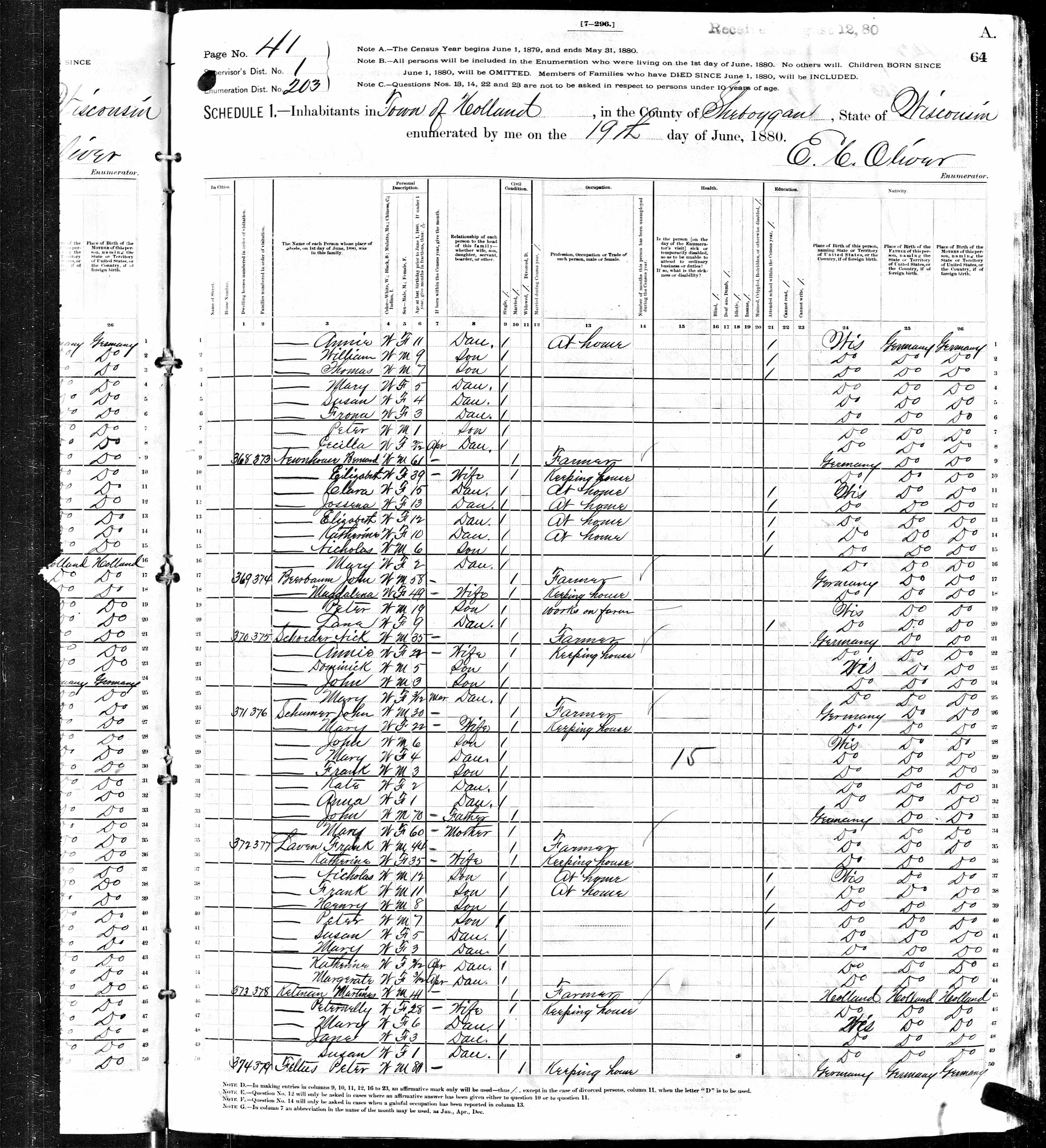 1880 Census Wisconsin, Sheboygan County, Holland Township