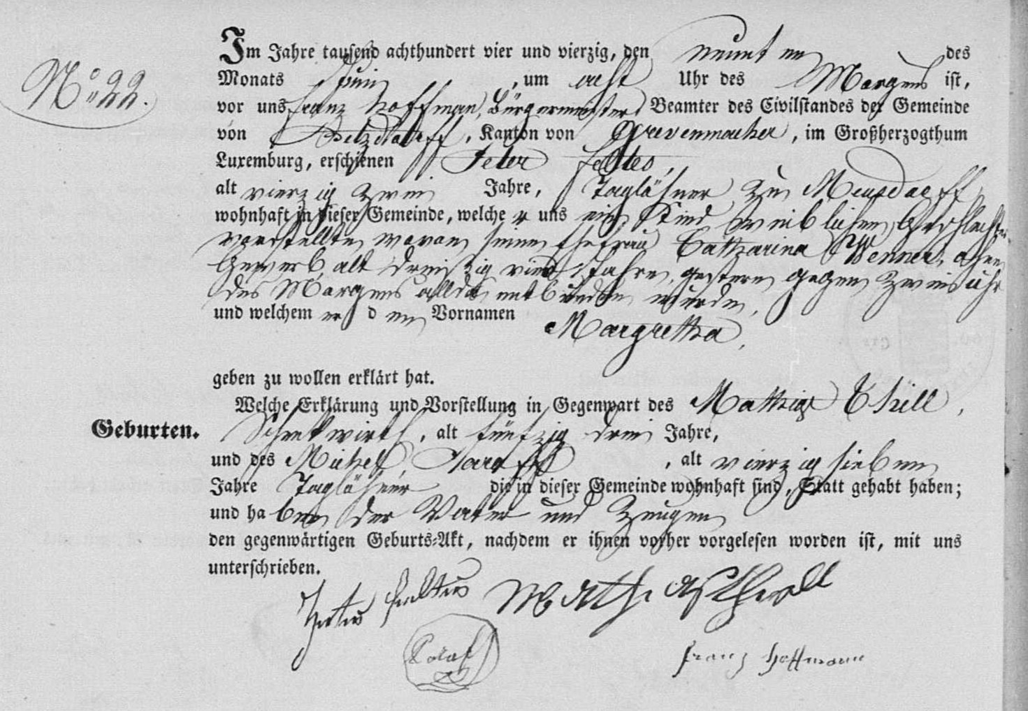 1844 birth of Marie Margaretha Feltes in Betzdorff/Mensdorf, Luxembourg