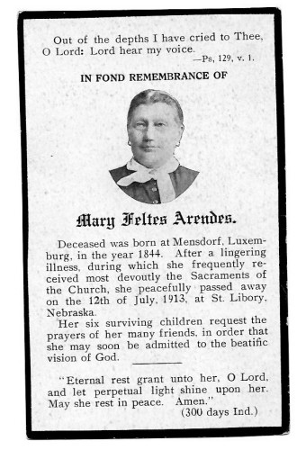 | Elisabeth Anna ARENDS MEYERS | Oct. 17, 1877 St. Libory, NE | Aug. 20, 1922 Beaver, KS | Nicholas John Meyers (1878-1928) on July 15, 1902 in Odin, KS | 10 | Saint Josephs Cemetery, Beaver, Baeton County, Kansas |
