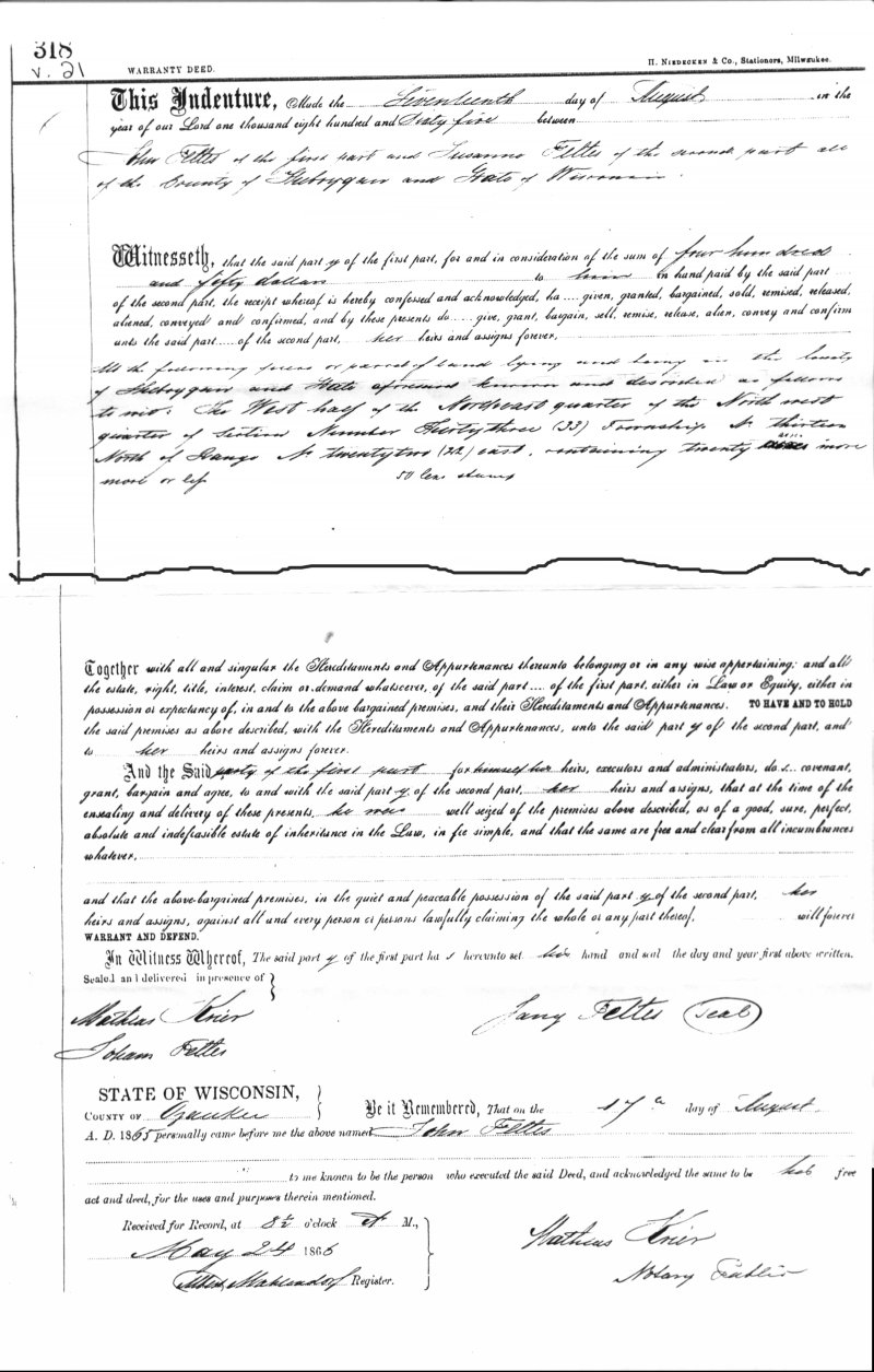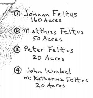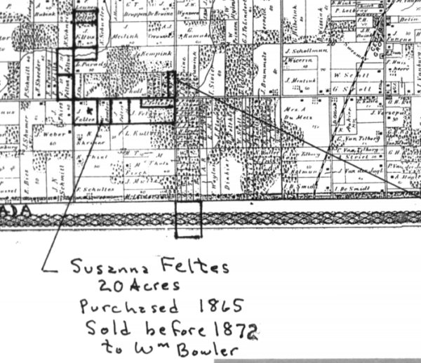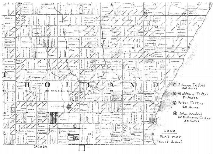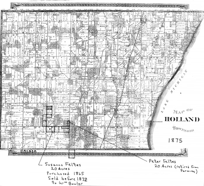 "The remaining parcels of land were owned by three sons of Johann Feltes (all were named John). Johann Sr. went to Iowa, then Kansas, but returned to Holland Twp by 1880. Peter retired from farming, died 1885 in Holland Twp. His daughter moved to Kansas about 1866-67."
