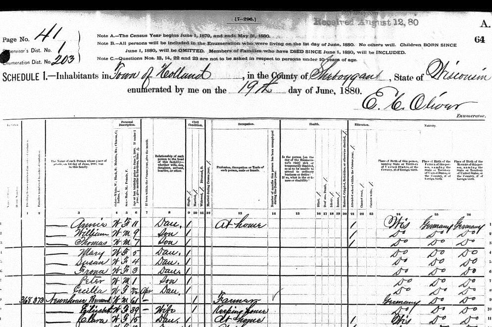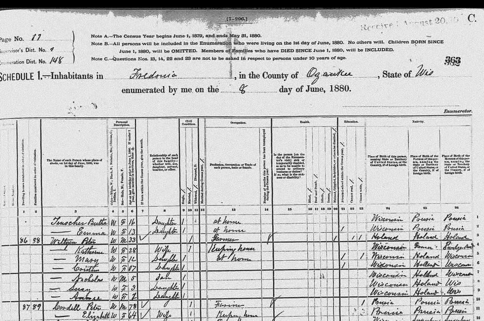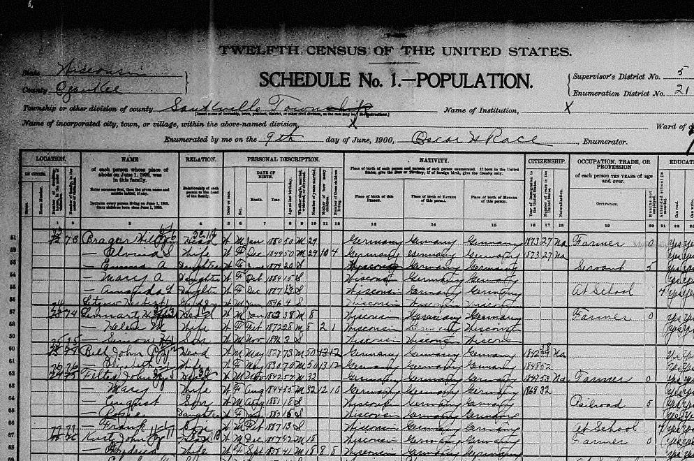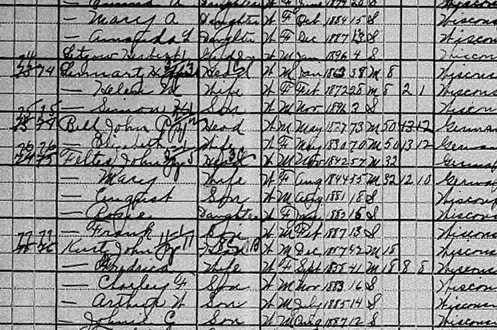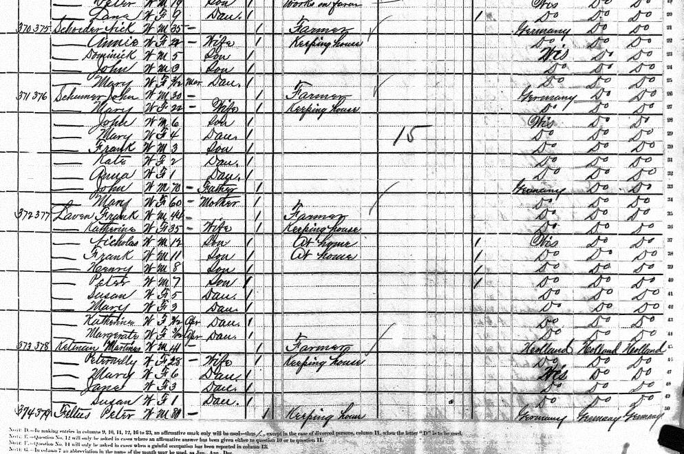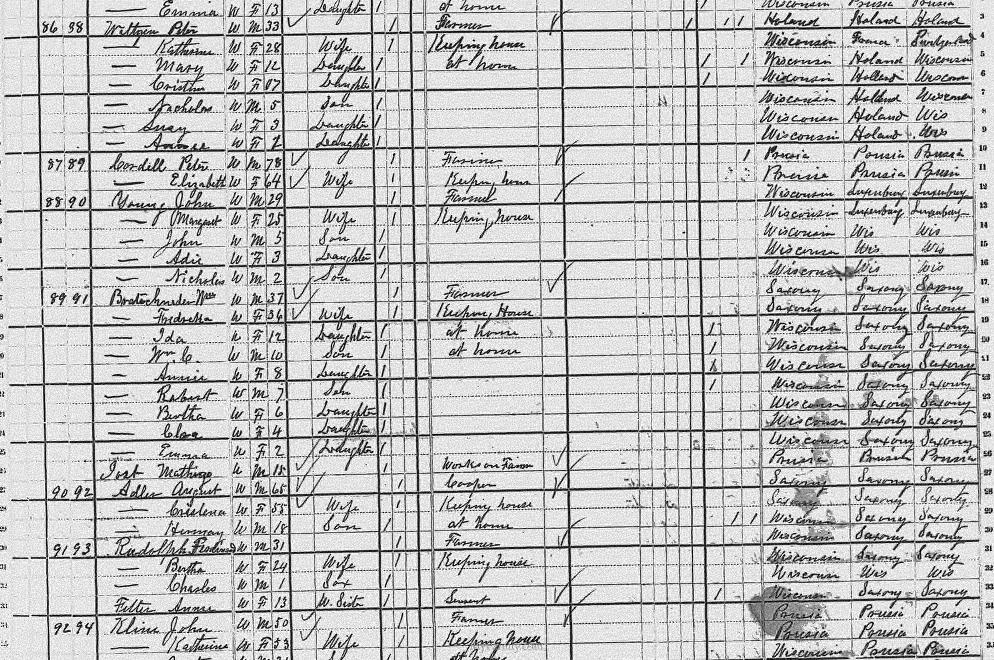| Feltes | Annie | W | F | 13 | W. Sister | Single | Servant | Wisconsin | Saxony | Saxony |