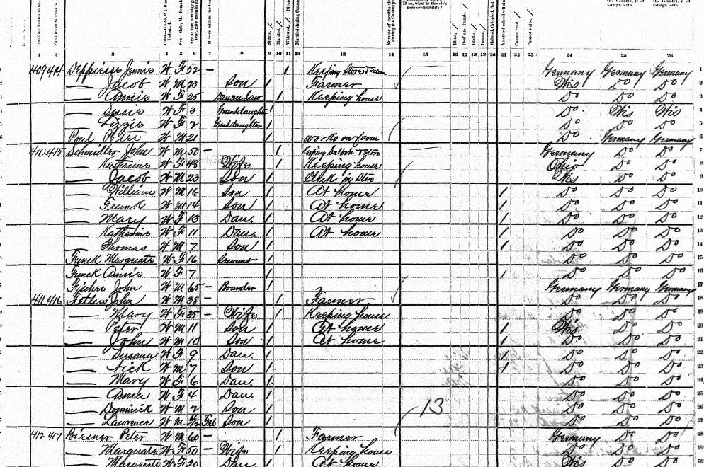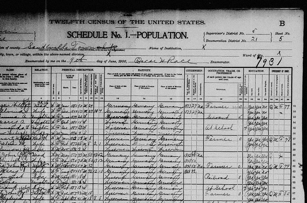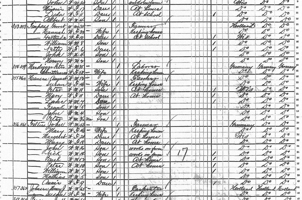 | Feltus | John | W | M | 38 | Head | Married | Farmer | Germany | Germany | Germany | |