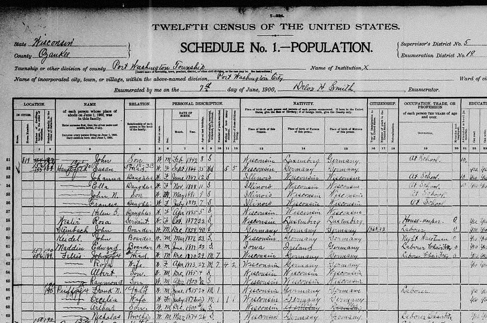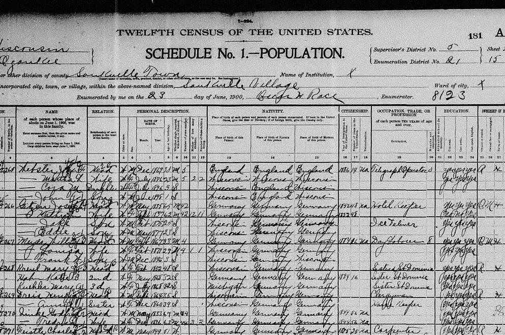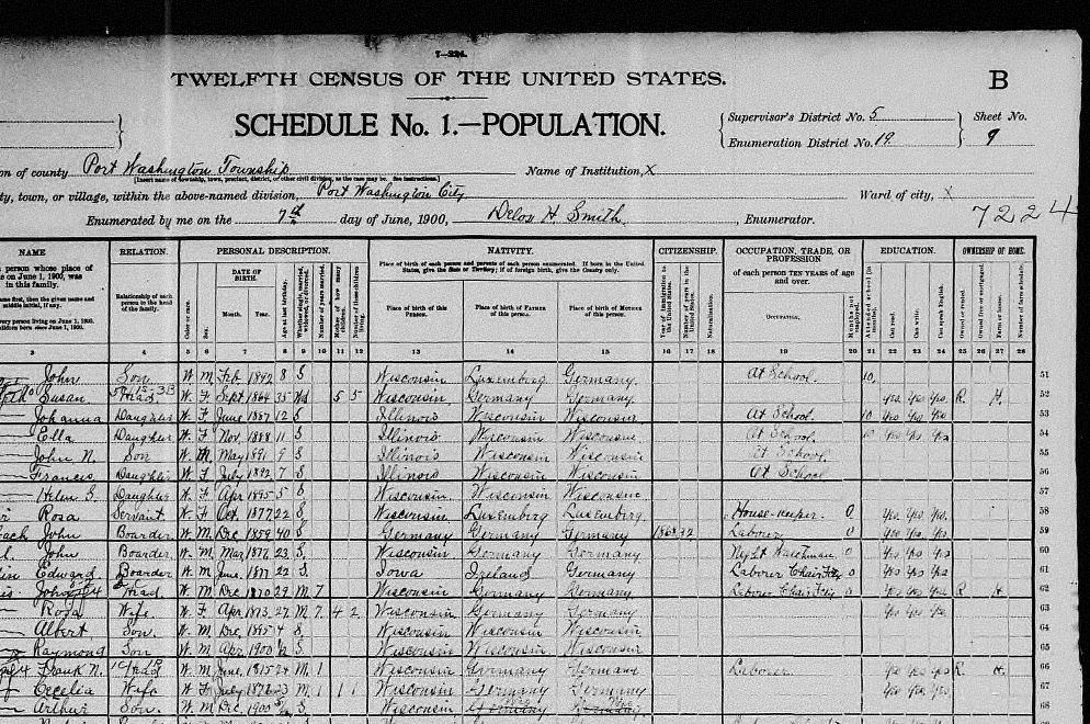 | Raymond | Son | W | M | Apr | 1900 | 1/12 | S | Wisconsin | Wisconsin | Wisconsin |