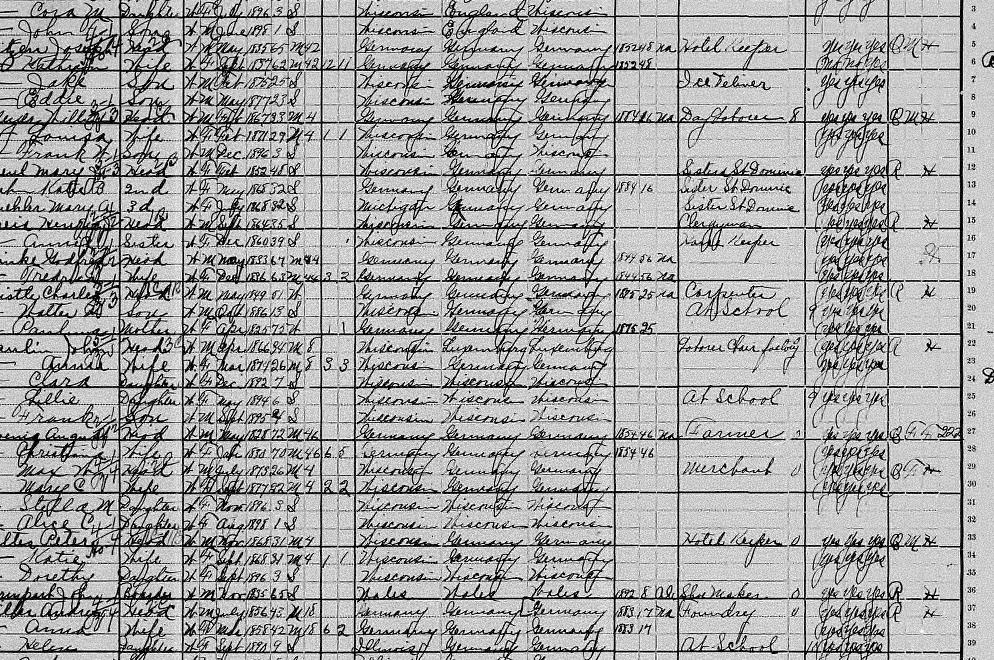 | Rosie | Daughter | W | F | Jan | 1885 | 15 | S | Wisconsin | Germany | Germany | can read, can write, speaks English. | ||||||
