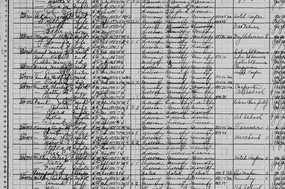 | Feltes | Peter | Head | W | M | Nov | 1868 | 31 | M | 4 | Wisconsin | Germany | Germany | Hotel Keeper unemployed 0 months, can read, can write, can speak English, owns mortgaged home. | ||||