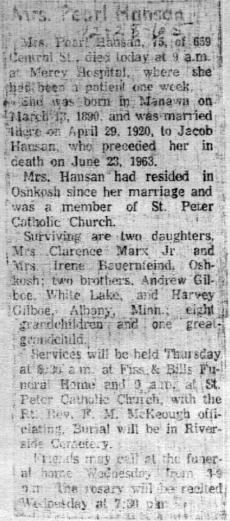 | Jacob HANSAN (Jake) | Sep. 5, 1878 Holland Township, WI | June 23, 1963 Oshkosh, WI | Pearl Gilboe (1890-1965) on Apr. 29, 1920 in St. Peter's Church, Oshkosh, WI | 2 | Riverside Cemetery, Oshkosh, WI FAG | Lived in Oshkosh, WI |