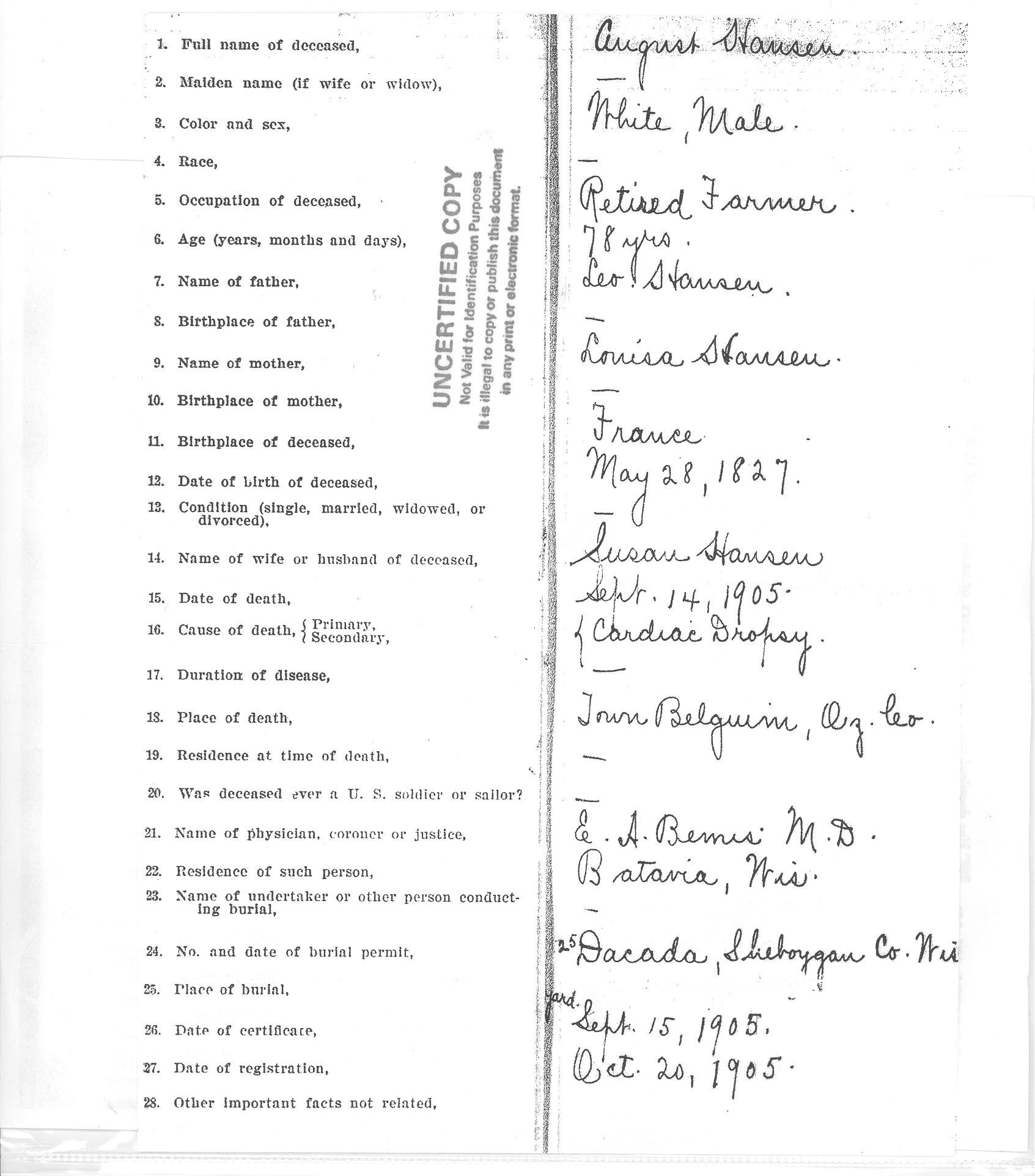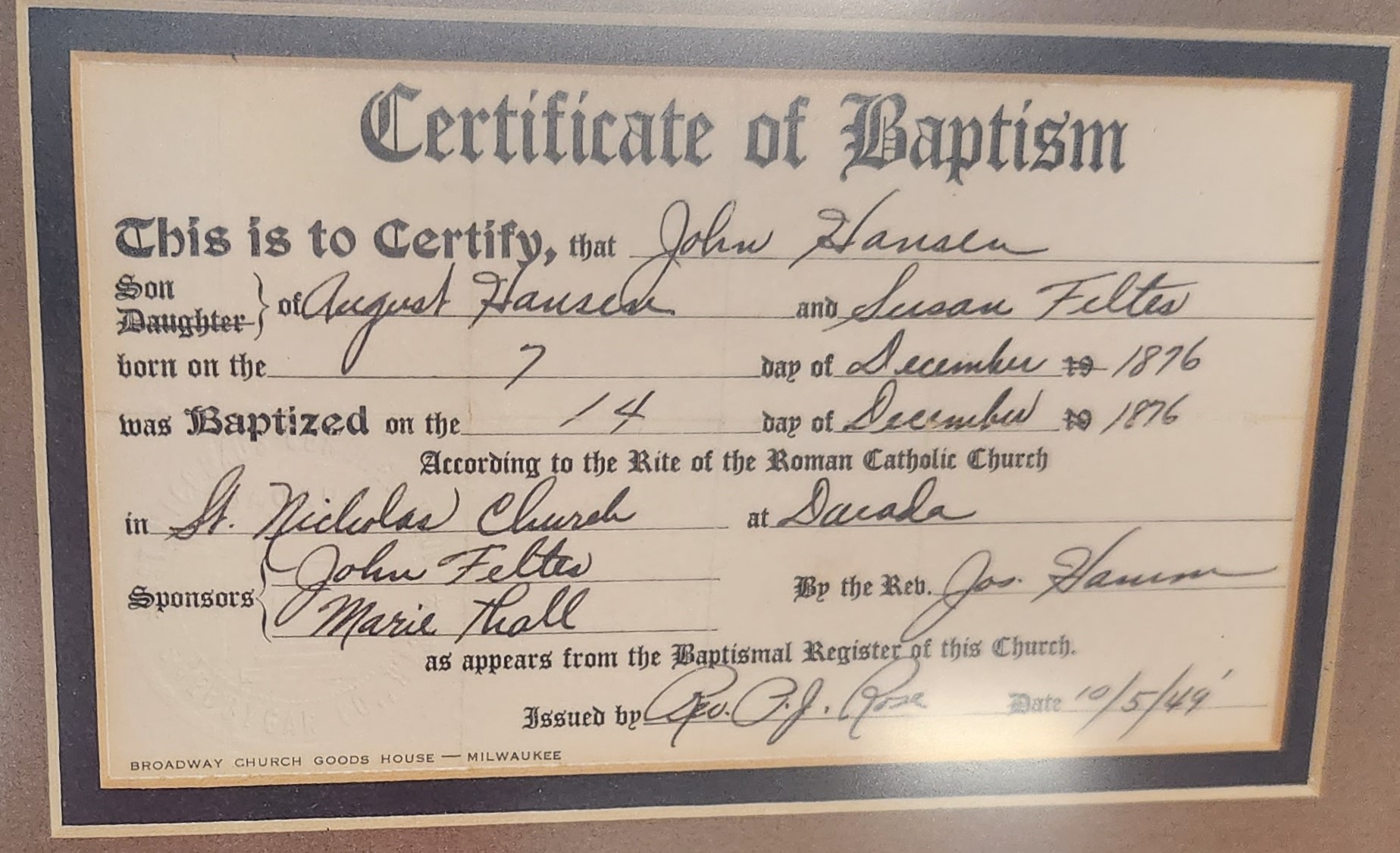 | John E. HANSEN | Dec. 7, 1876 Holland Township, WI | Aug. 17, 1955 | Susan Rasaal (1888-1987) On Oct. 15, 1907 in St. Nicholas Church, Dacada, WI | 3 | St. Nicholas Cemetery, Dacada, WI FAG | Lived in Random Lake, WI |