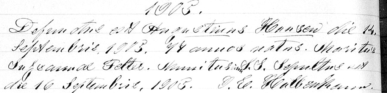 | Emma Anna Maria HANSEN | Mar. 22, 1871 Holland Township, WI | Sept. 14, 1879 Holland Township, WI | not married | - | St. Nicholas Cemetery, Dacada, WI Buried near Katharina Feltes grave. FAG | She was baptised as Marie Mar. 23 in St. Nicholas Church in Dacada. | |