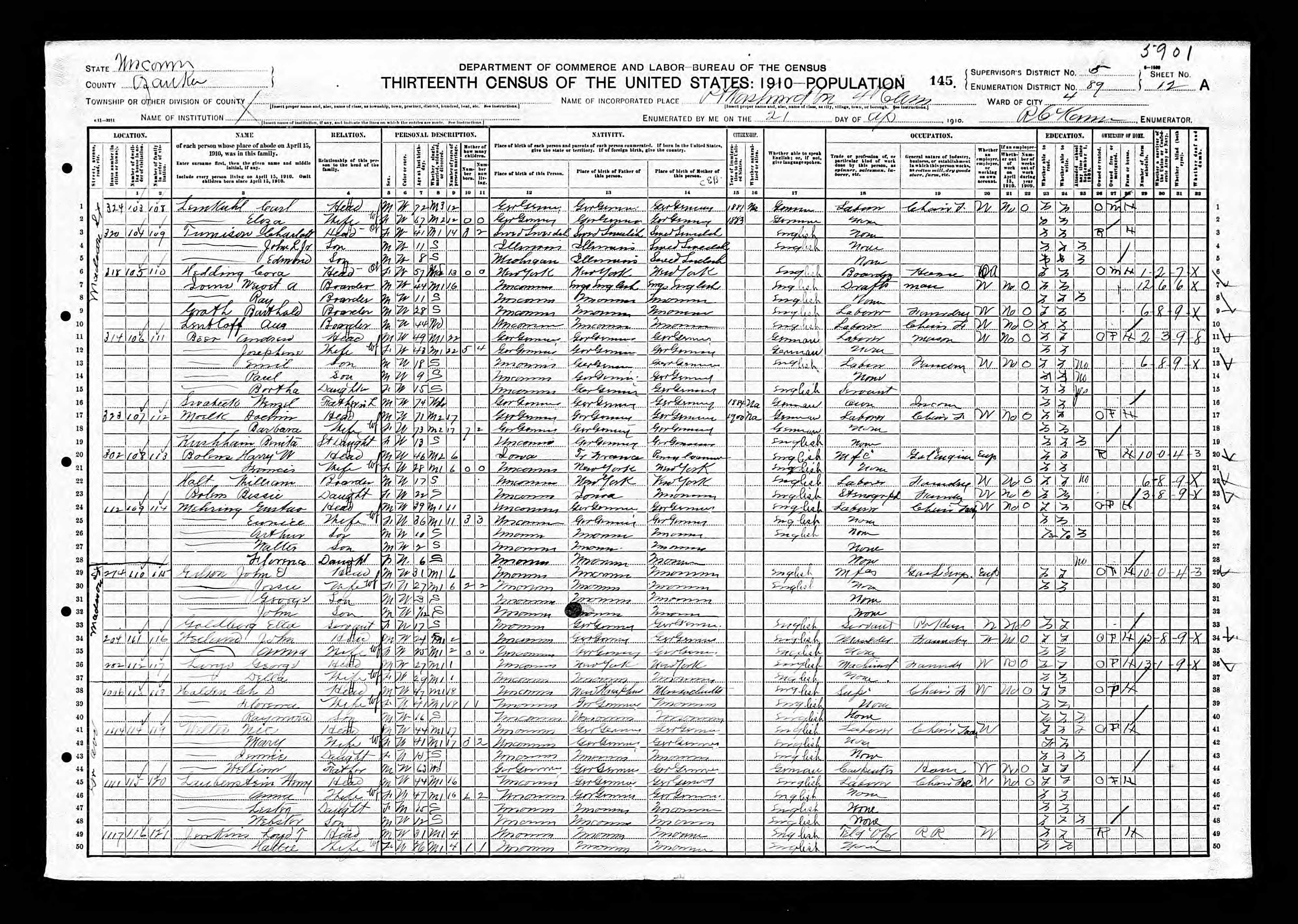 1910 Census Wisconsin, Ozaukee County, Port Washington
