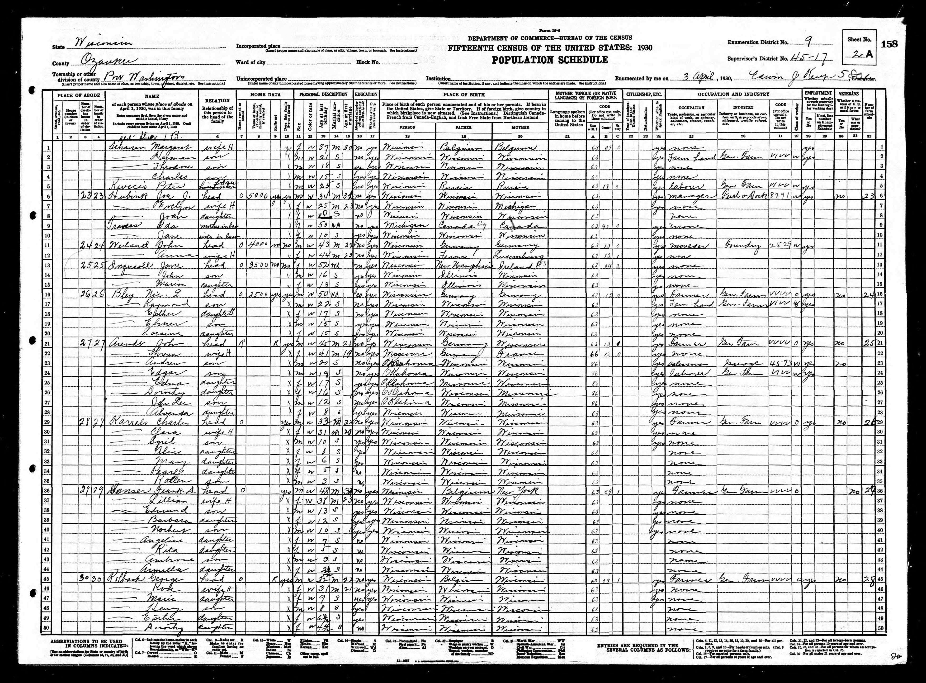 1930 Census Wisconsin, Ozaukee County, Port Washington