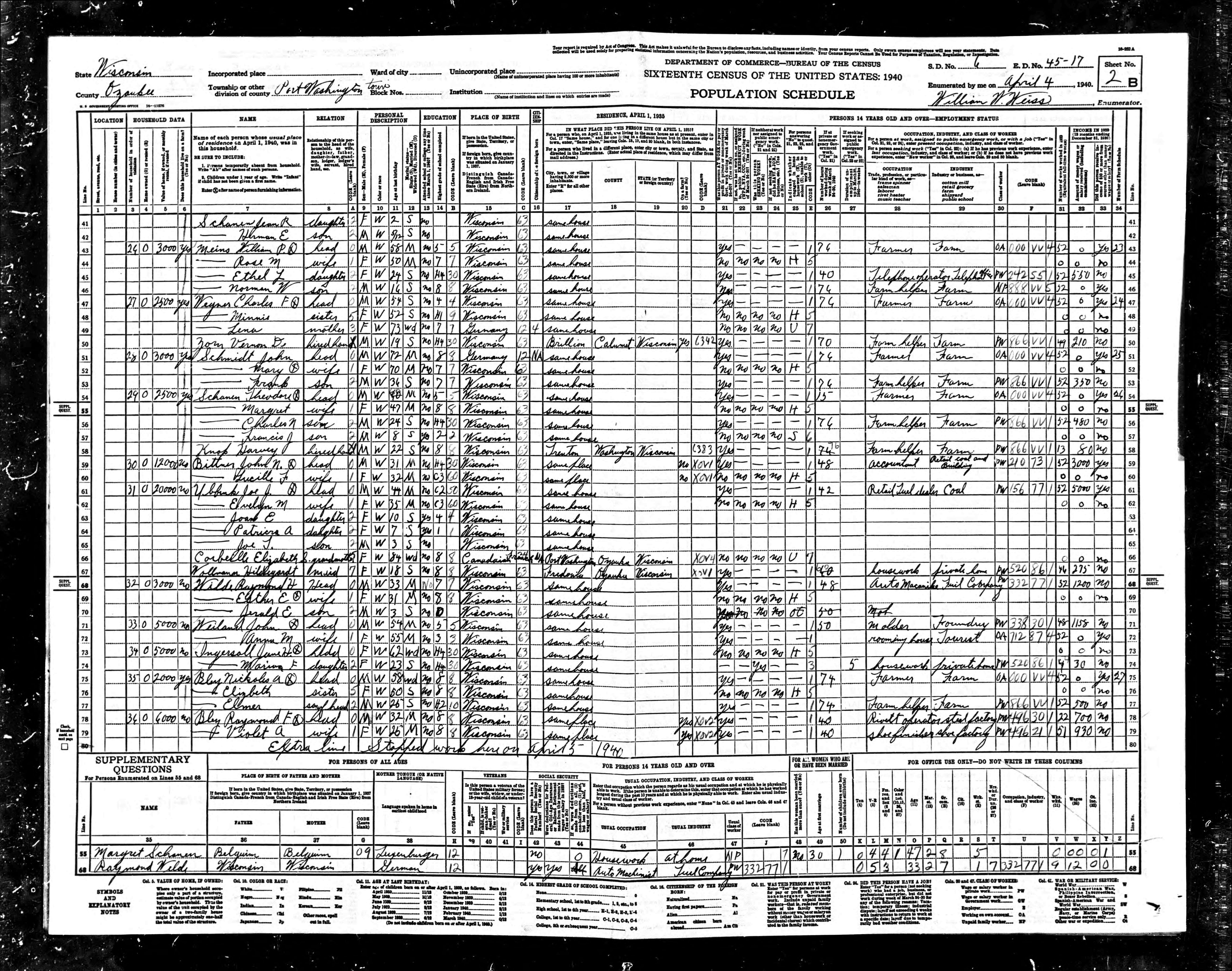 1940 Census Wisconsin, Ozaukee County, Port Washington