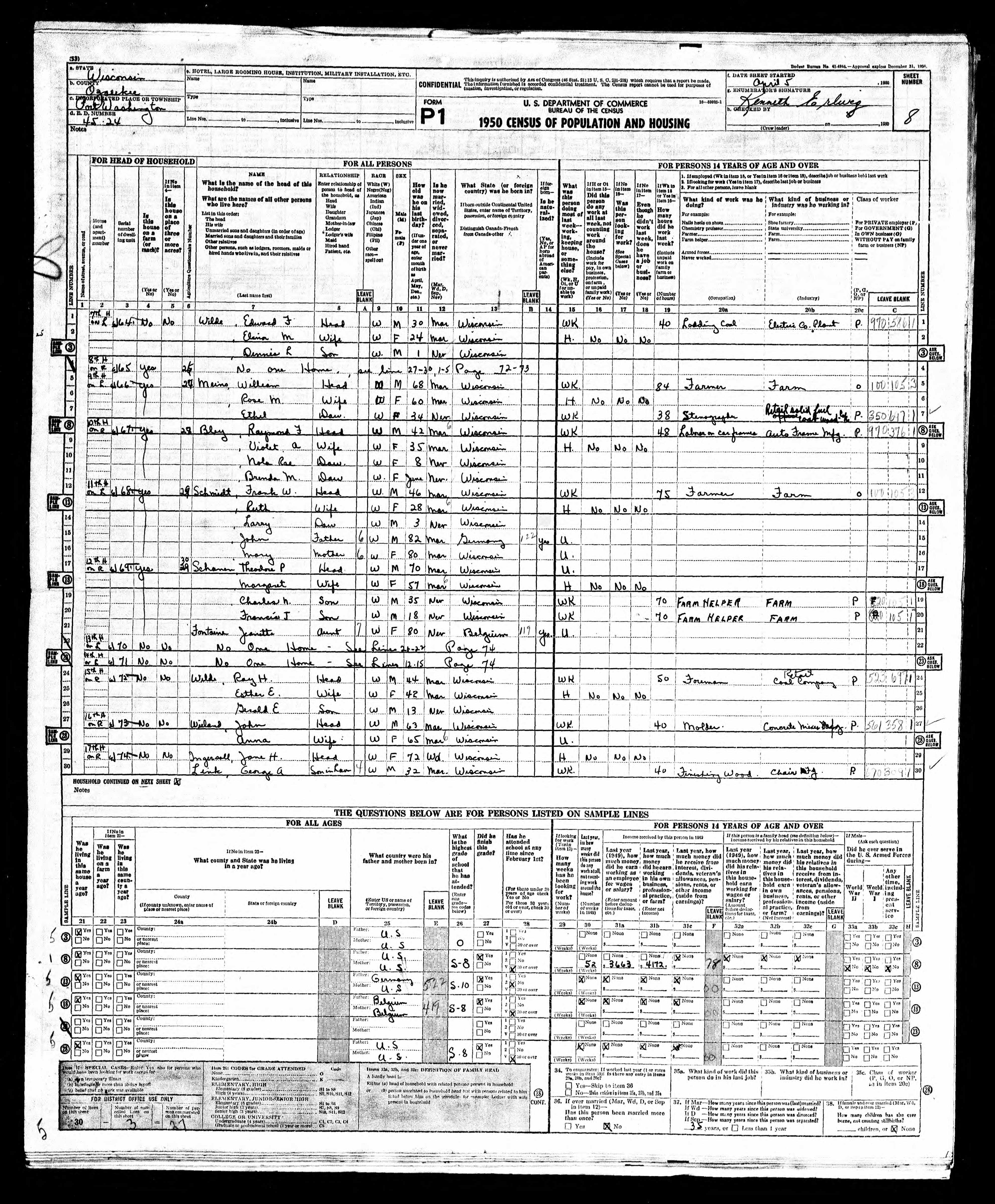 Saukville Road (Farm).; Weiland, John age 34, Occupation: Moulder in a Foundry; wife Anna age 35. | |