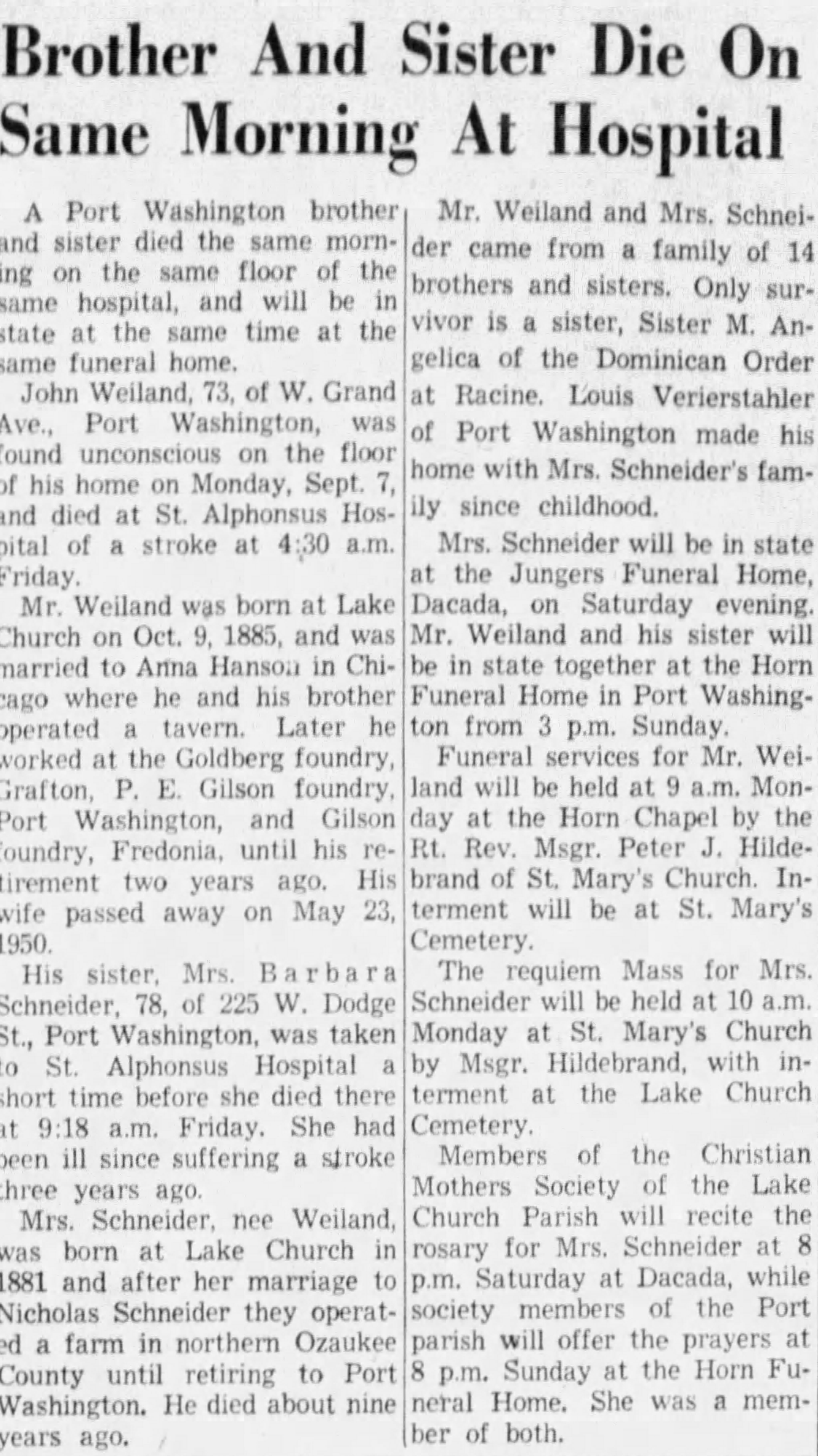 | 15 1959 Obituary of John Weiland in The Sheboygan Press, September 12, 1959 | |