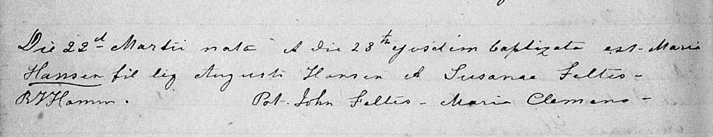 | BAPTISED: | March 23, 1871 St. Nicholas Catholic Church, Dacada, Ozaukee, Wisconsin. Baptised as Marie. Her Godparents were John Feltes and Marie Clemens. 11 |