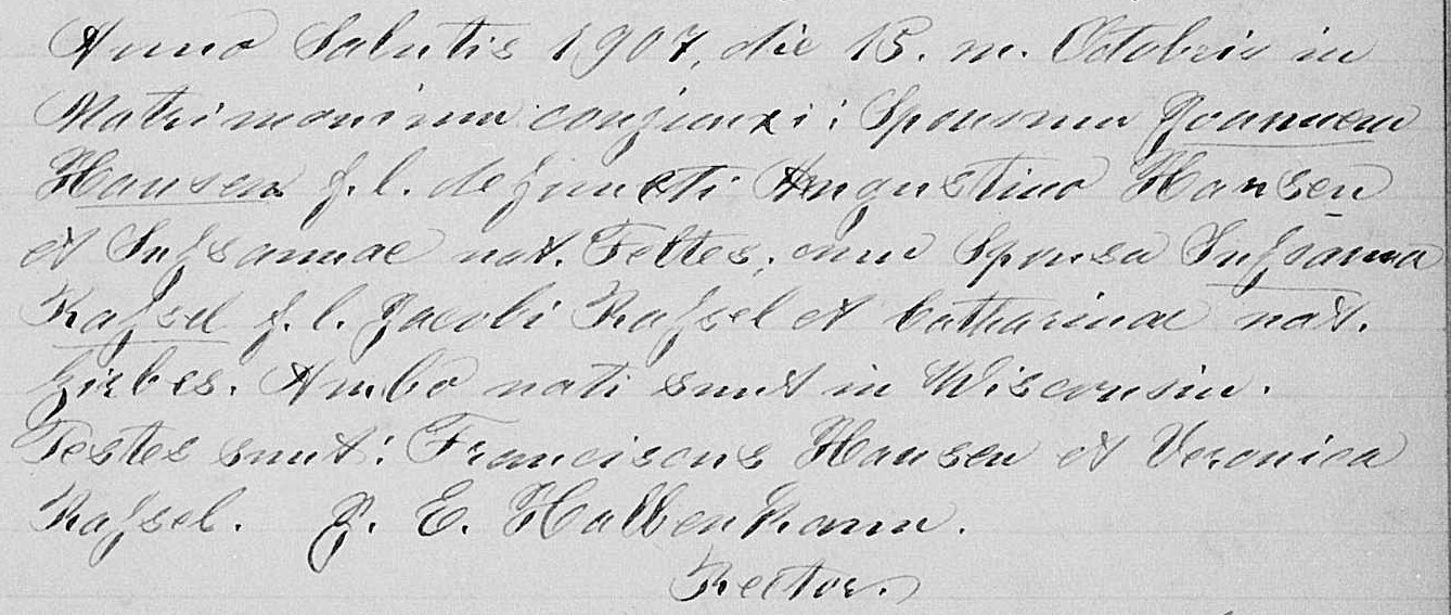 1907 Entry form the St. Nicholas Church record book for the marriage of John Hansen and Susan Rassel