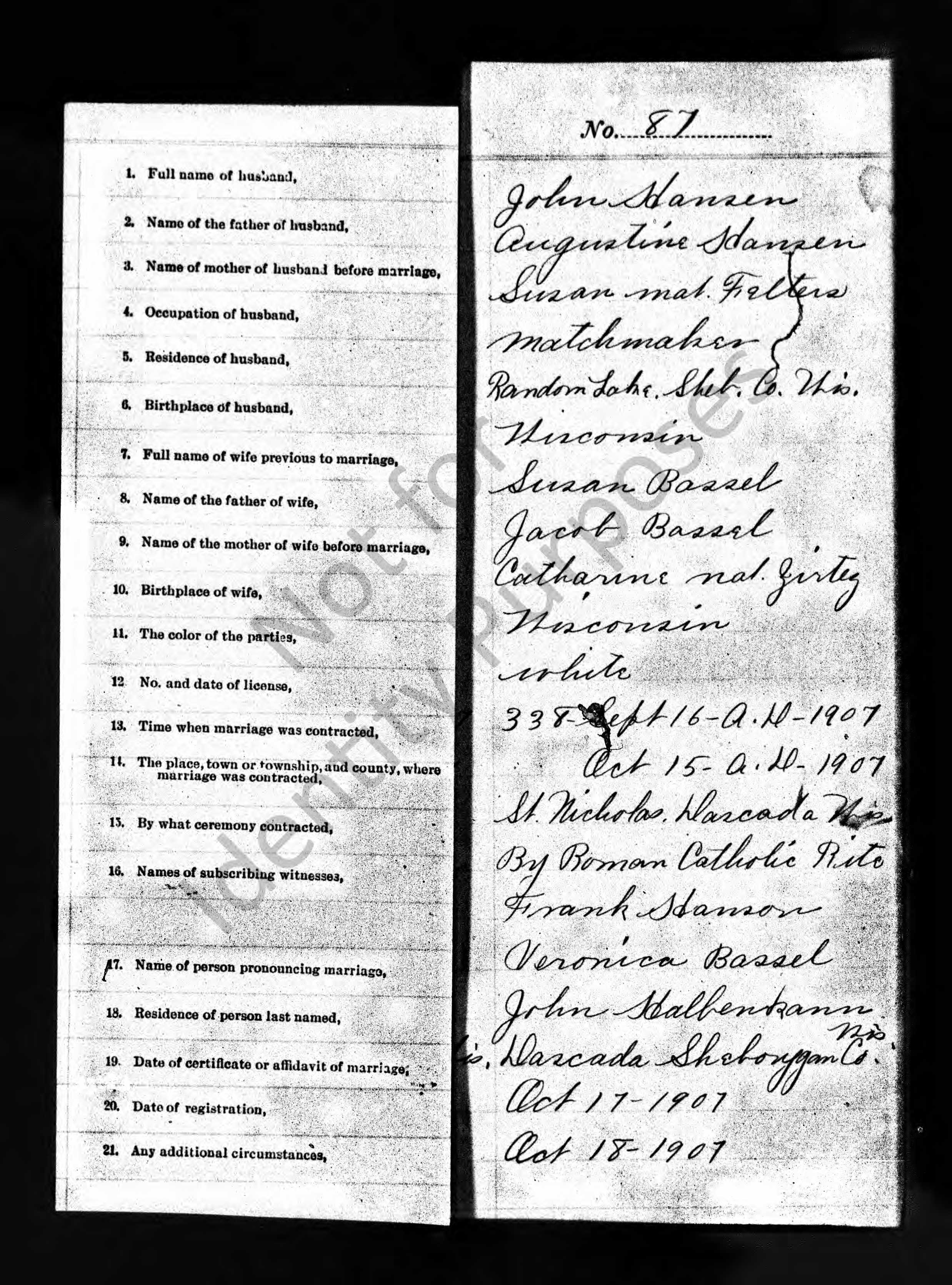 | 13 1907 Marriage Record of John Hansen and Susan Rassel | ||||||||||||||||||||||||