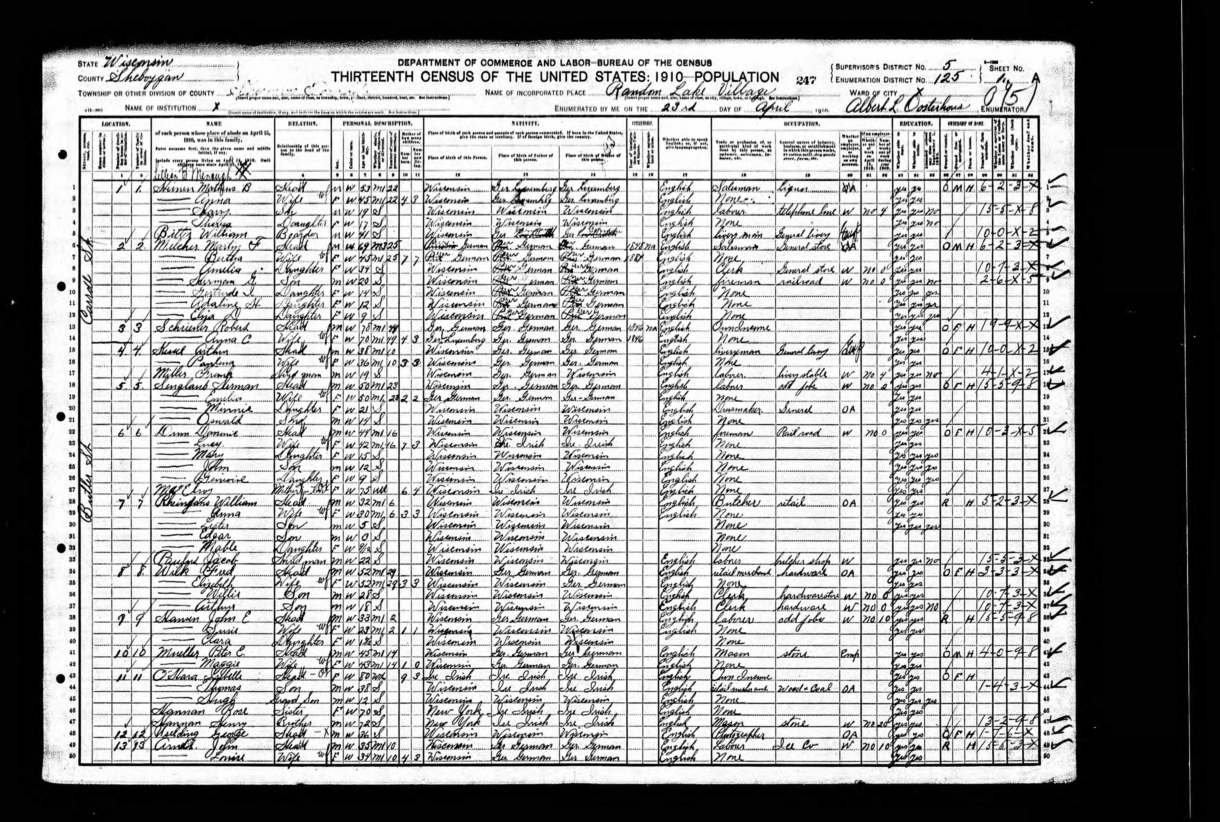 1940 Census Wisconsin, Sheboygan County, Random Lake