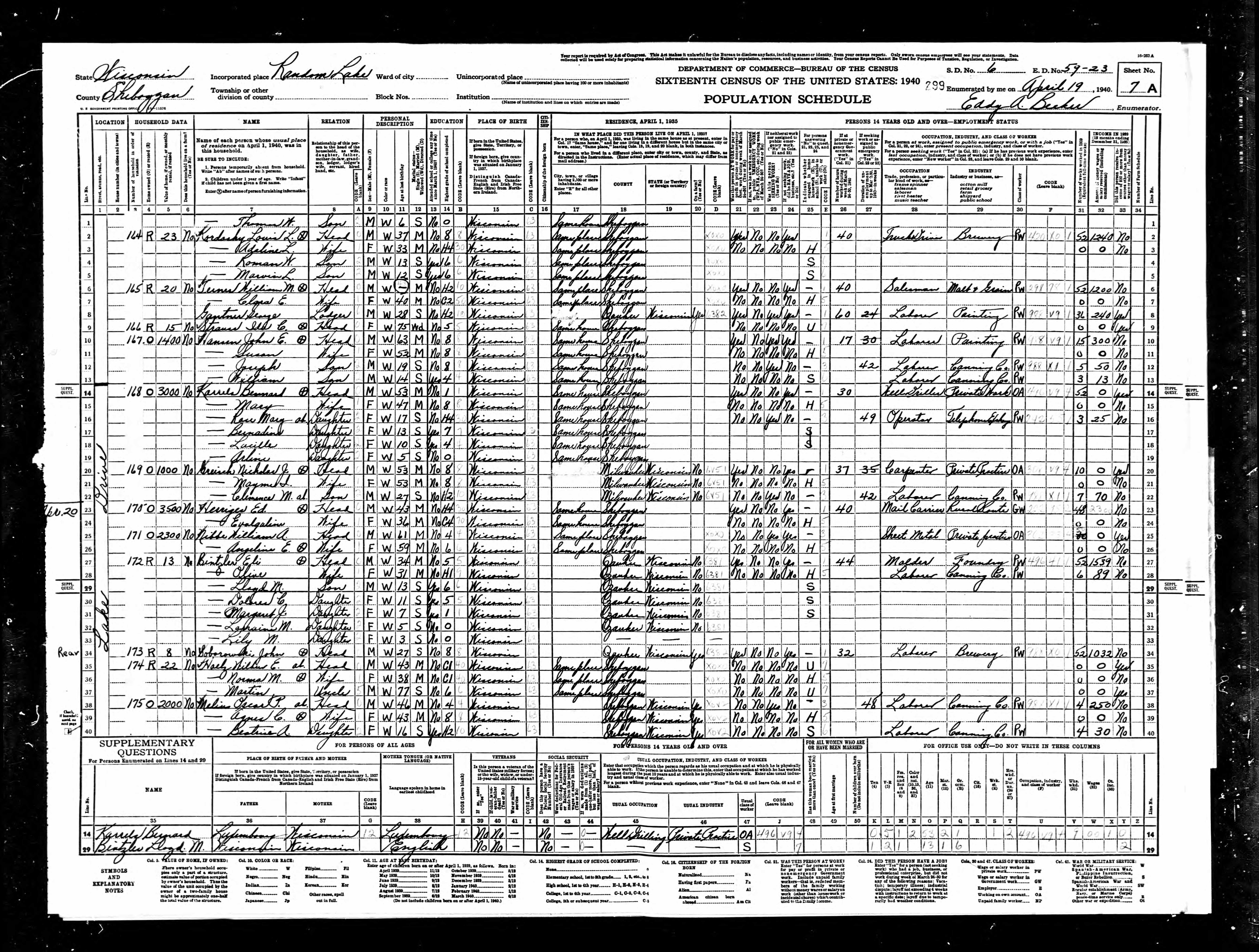 1940 Census Wisconsin, Sheboygan County, Random Lake