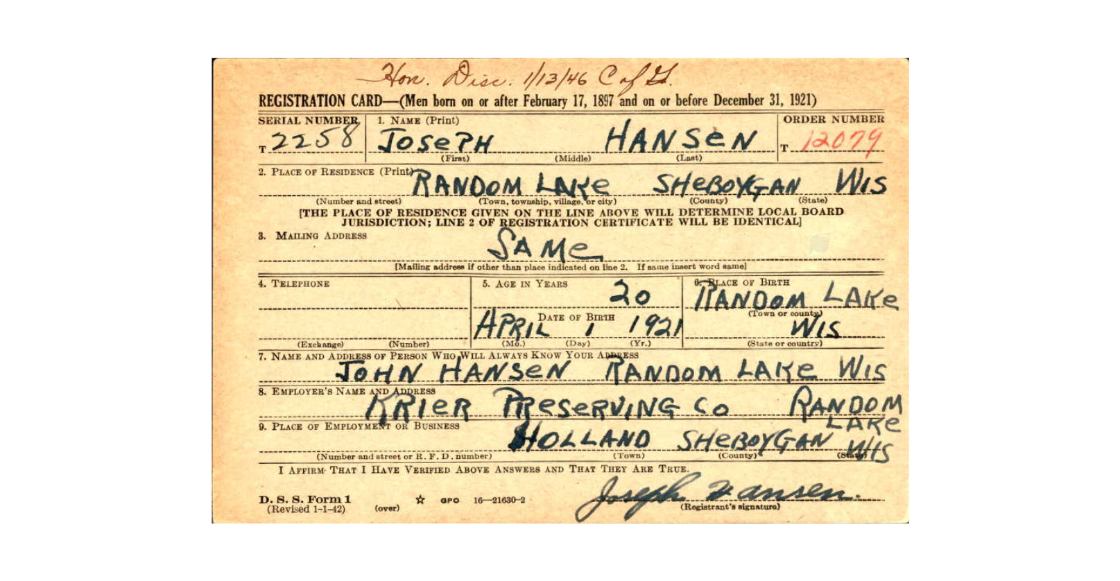 | 12 1941 Draft Registration Card for Joseph Hansen | |