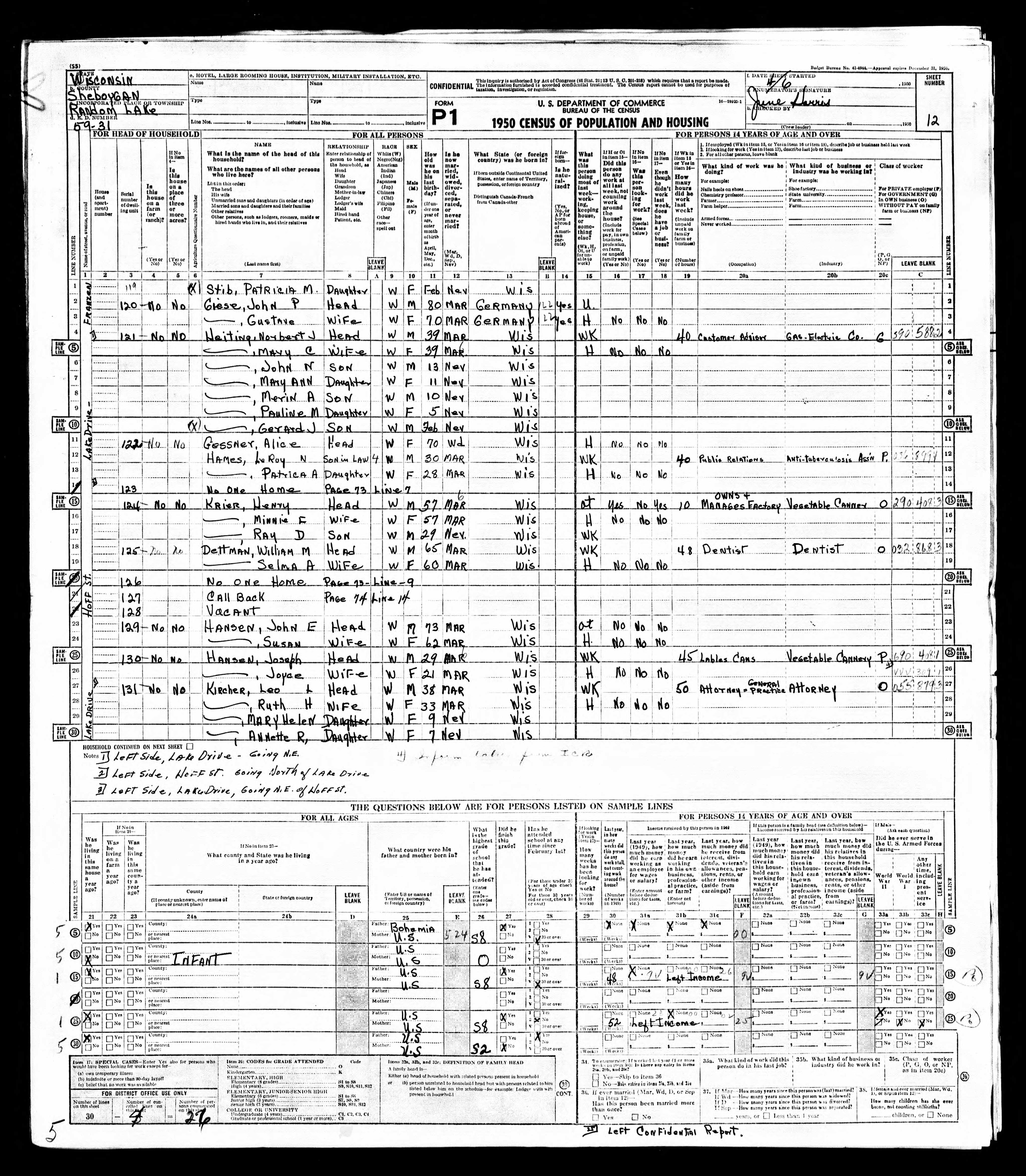 1950 Census Wisconsin, Sheboygan County, Random Lake