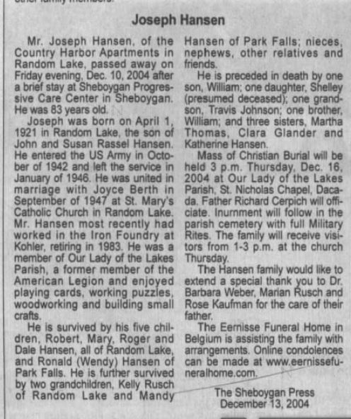 | 14 2004 Obituary of Joseph Hansen in The Sheboygan Press. | |