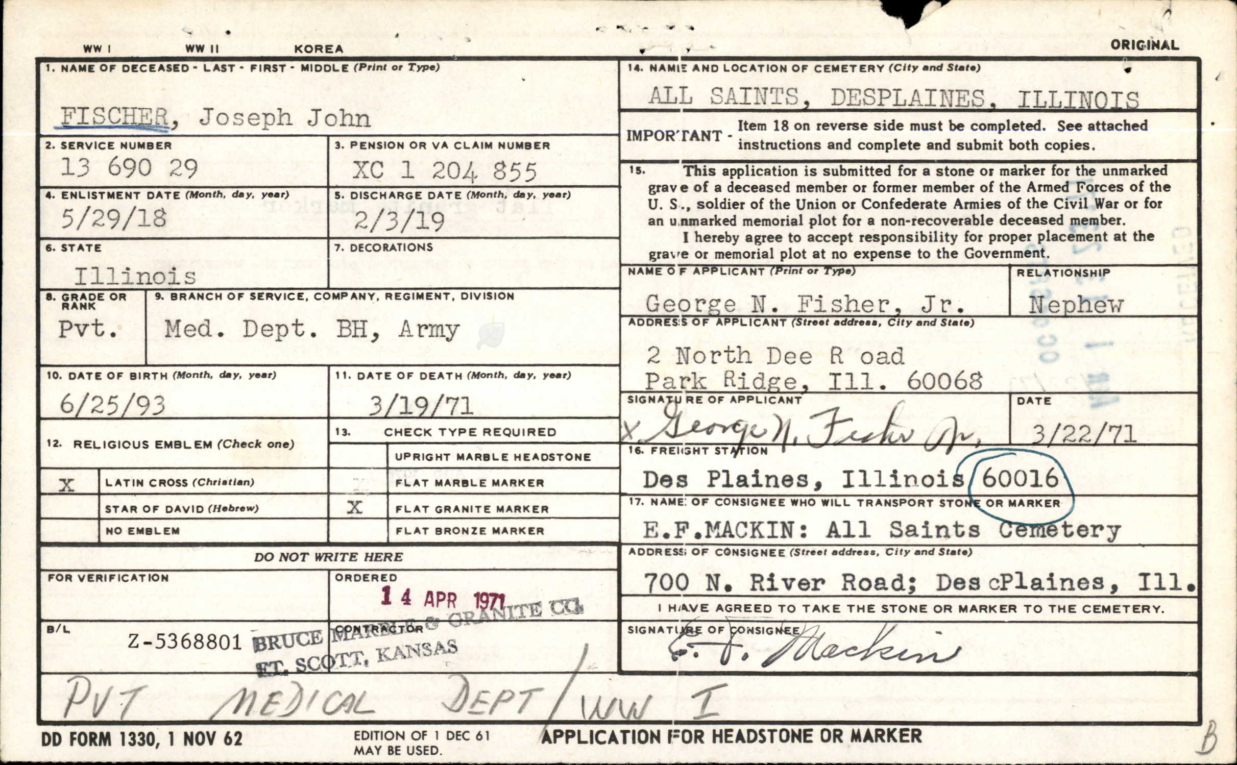 1971 Headstone Application
