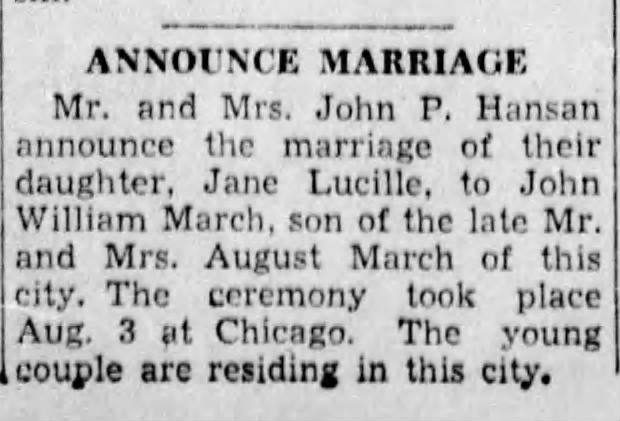 | 15 1936 Newspaper announcement of Marriage of Jane Lucille Hansan and John William March | |