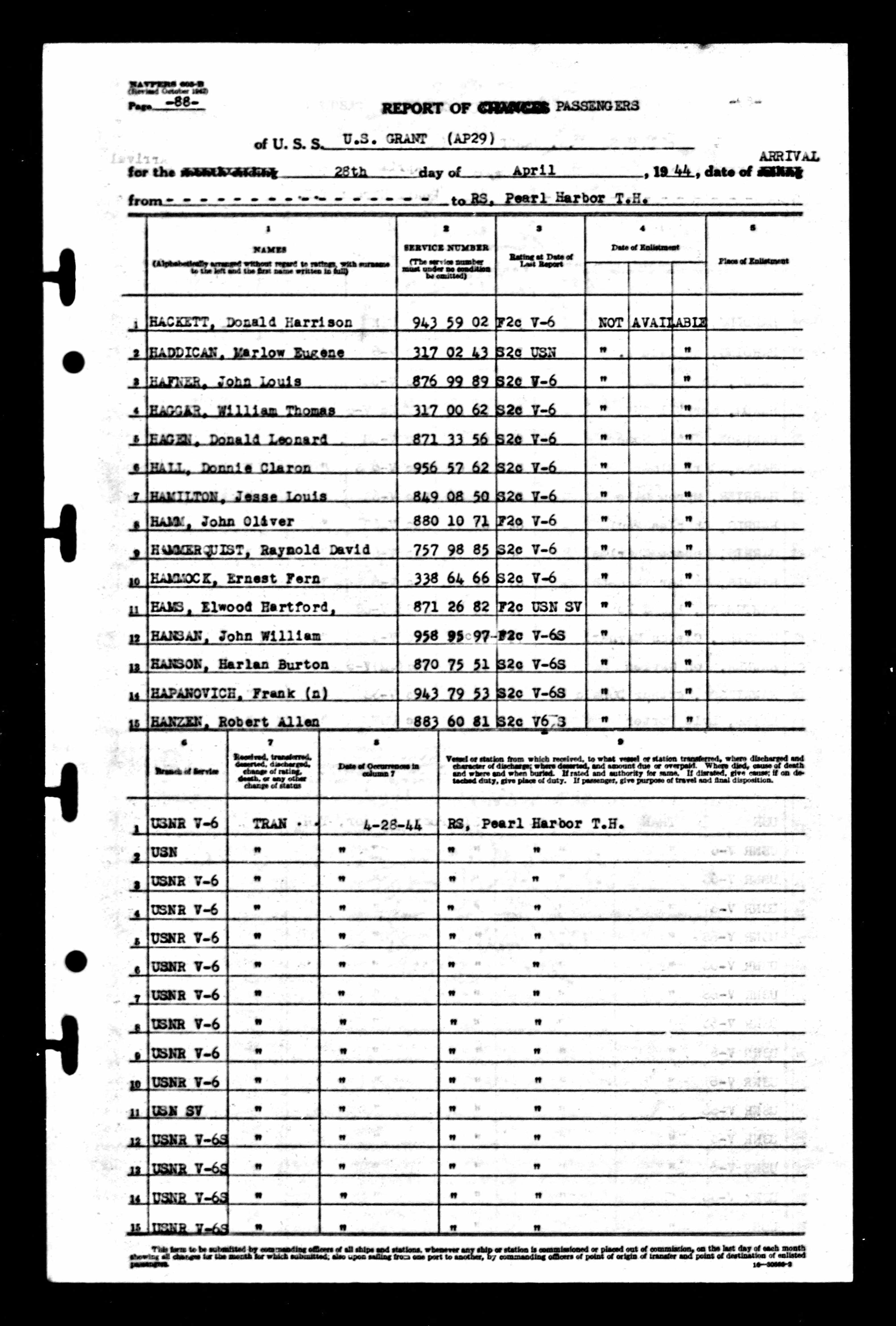 | 13 Navy Muster Rolls for WWII for John William Hansan in All U.S. WWII Navy Muster Rolls 1938-1949 on Ancestry One example: 1944 Muster Roll for the ship USS Grant containing John W. Hansan. Details on ship activity is from Wikipedia U.S. Grant, South Dakota, Napa. | |