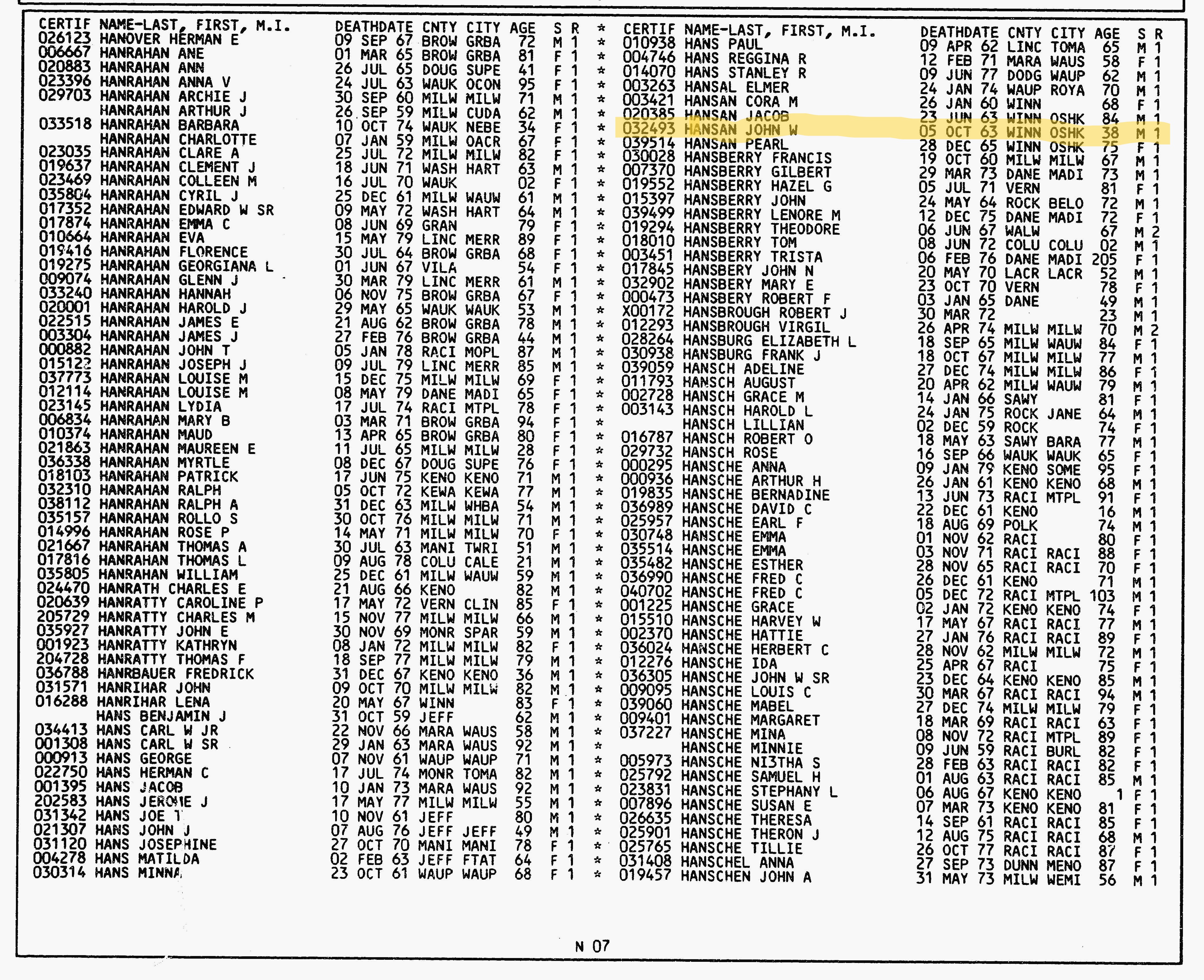 | 15 1963 Wisconsin Death Records Index for John W. Hansan | |