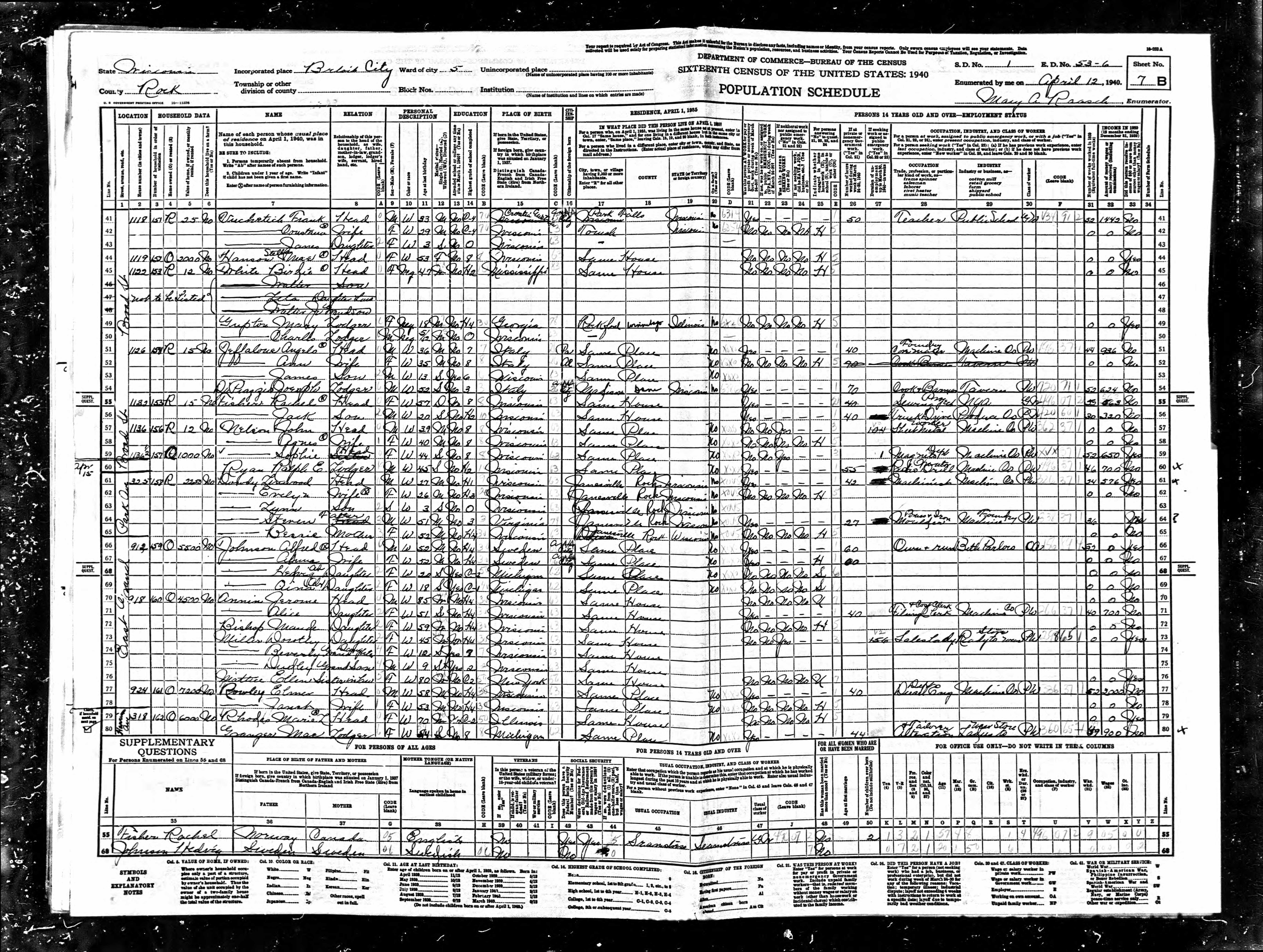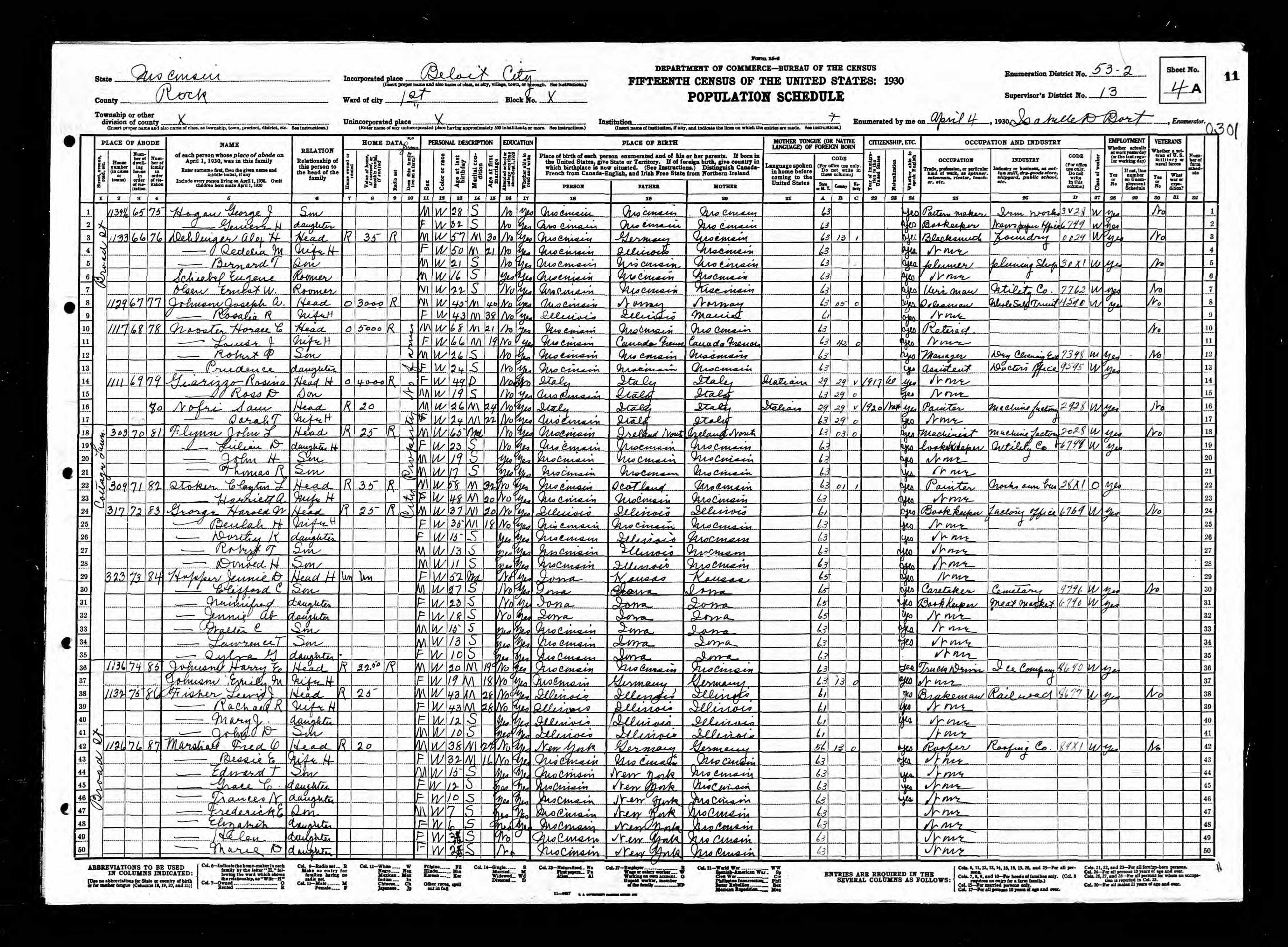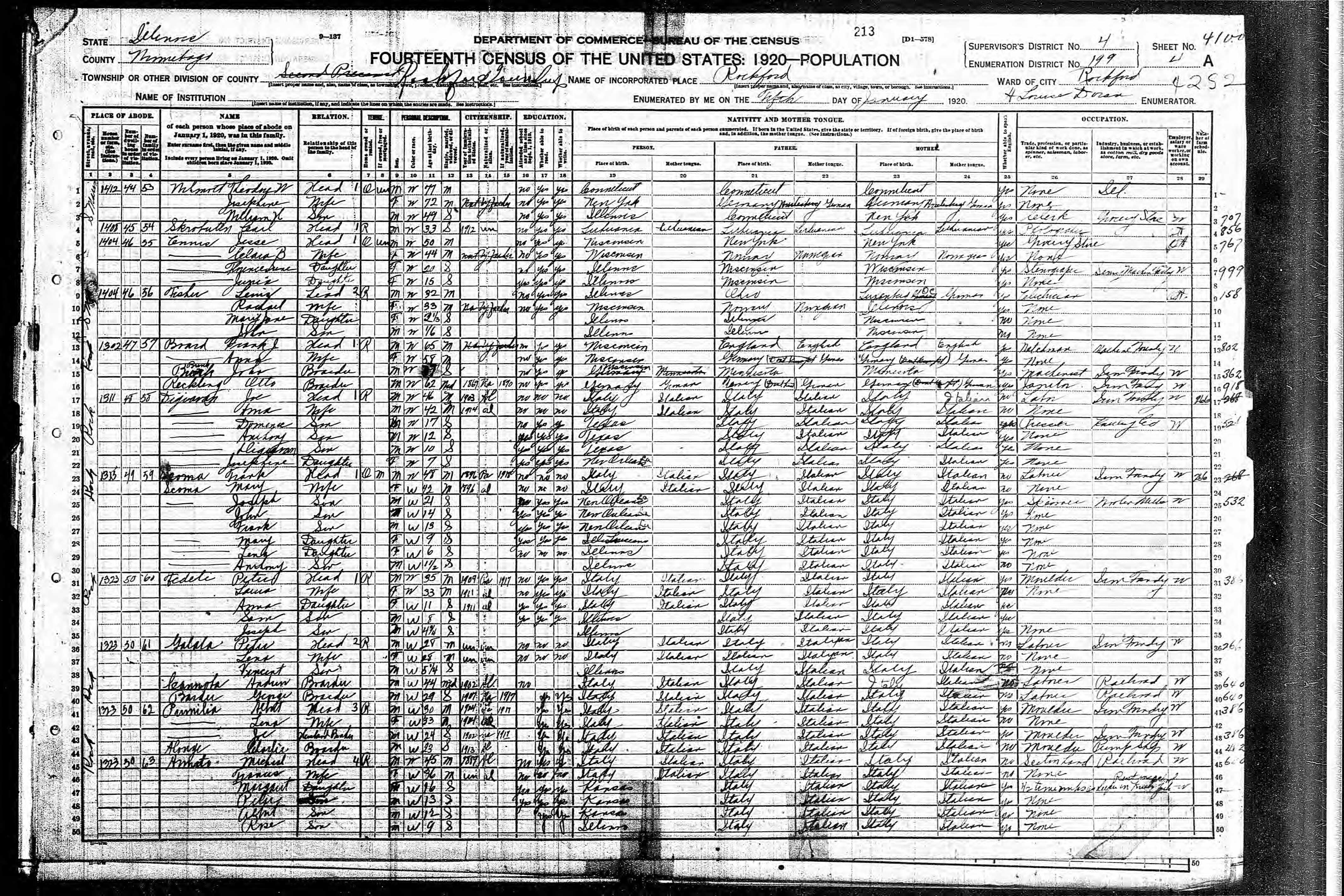 South Main #1404; Fisher, Louis 32 Illinois, parents from Ohio, Luxembourg, telectrician. rents home; Rachel, wife, 33 WI, parents from Norway; Mary Jane, daughter, 2 1/3 IL; John, son, 1/6 (Dec. 2019) IL; | |