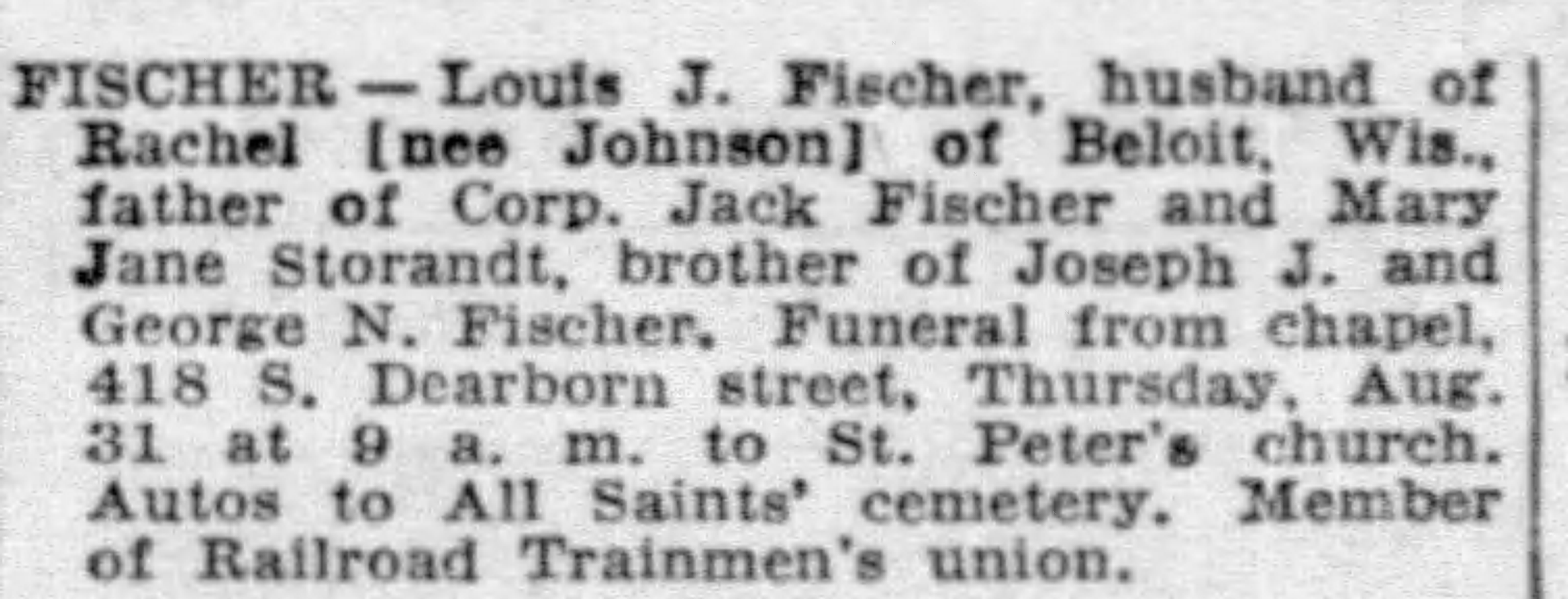 Louis J Fischer, born abt 1892 in Illinois, Died 29 Aug 1944 in Chicago, Cook, Illinois, Buried 31 Aug 1944 in Maine, Cook, Illinois, All Saints cemetery, age 52, Engineer, lived in Oak Park, Cook, IL, Father: Lewis Fischer of Ohio, Spouse: Rachel | |