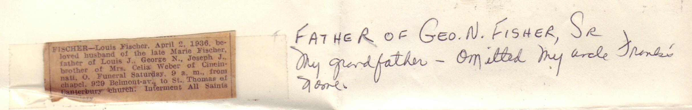 | Frank FISCHER | May 1891 Chicago, IL | Mar. 1932 | All Saints Catholic Cemetery, Des Plaines, IL, Section 11, Block 2, Lot 9, Grave 2 Find-a-grave | Family story is that he was killed hopping a freight train. | |||