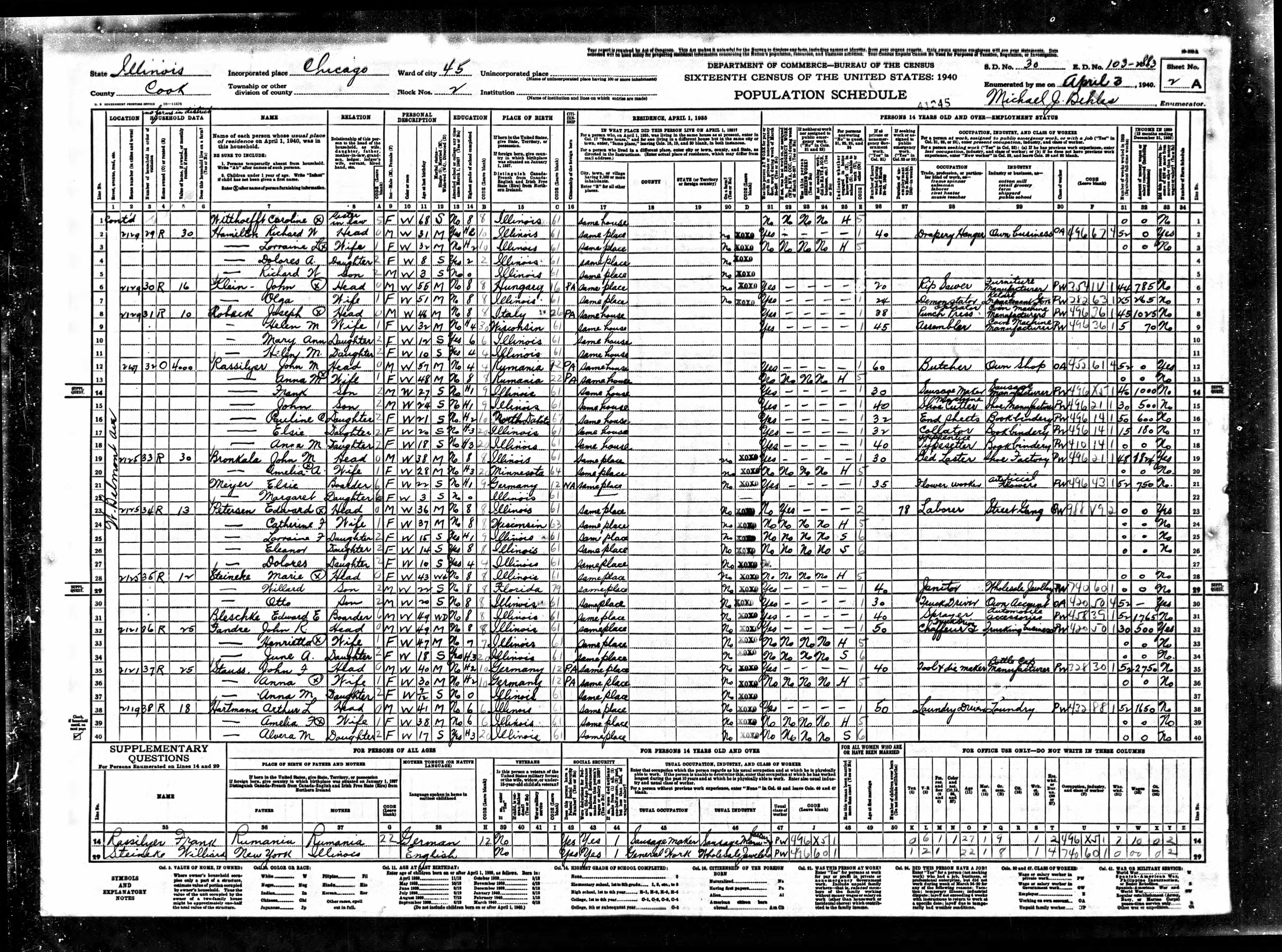 1940 Census of Chicago, Cook County, IL